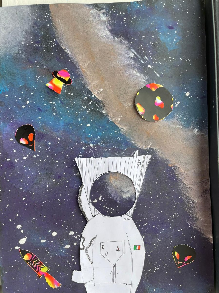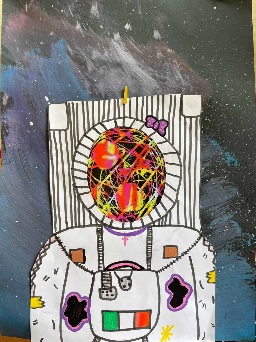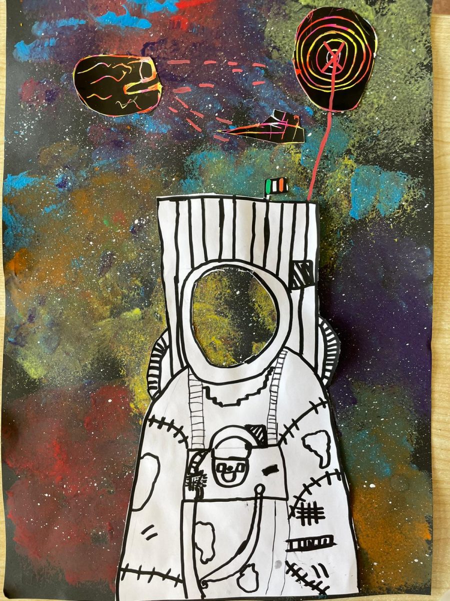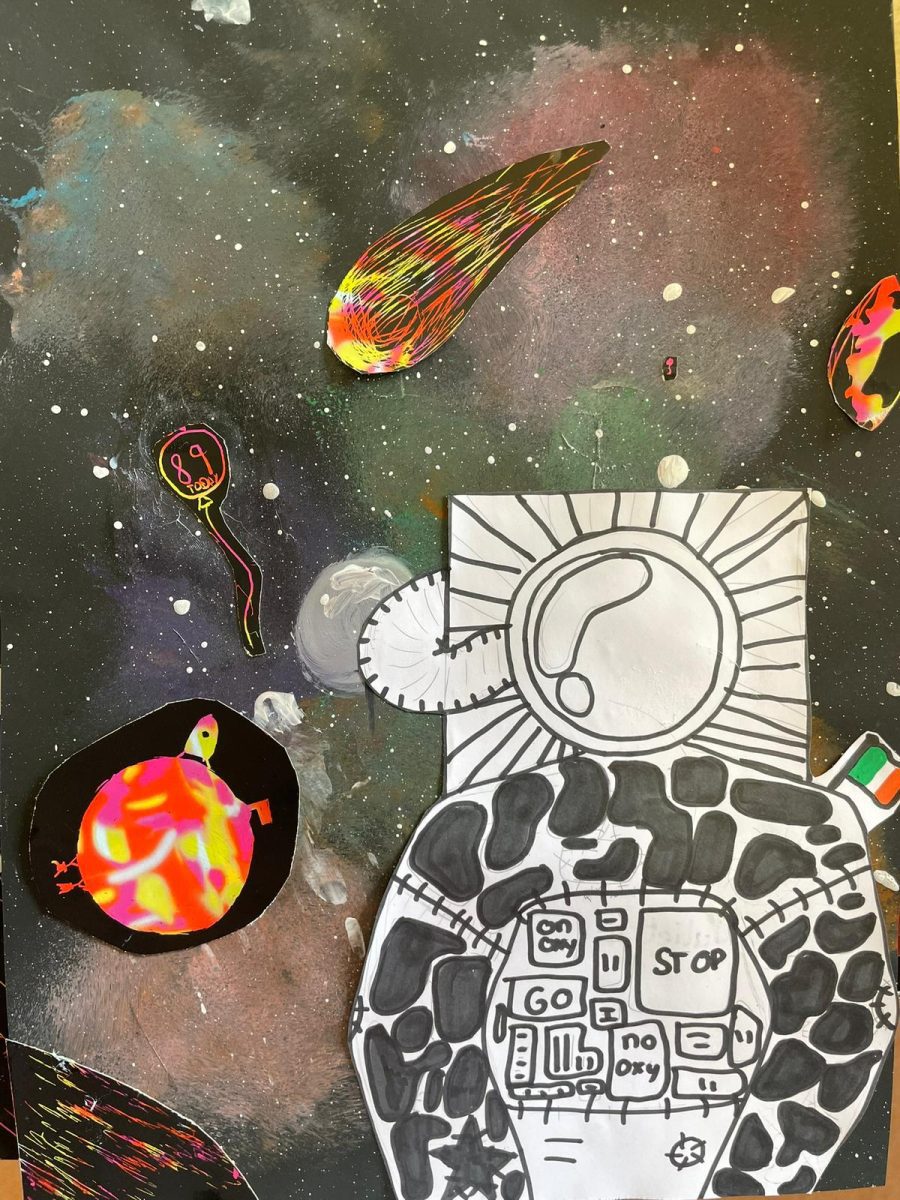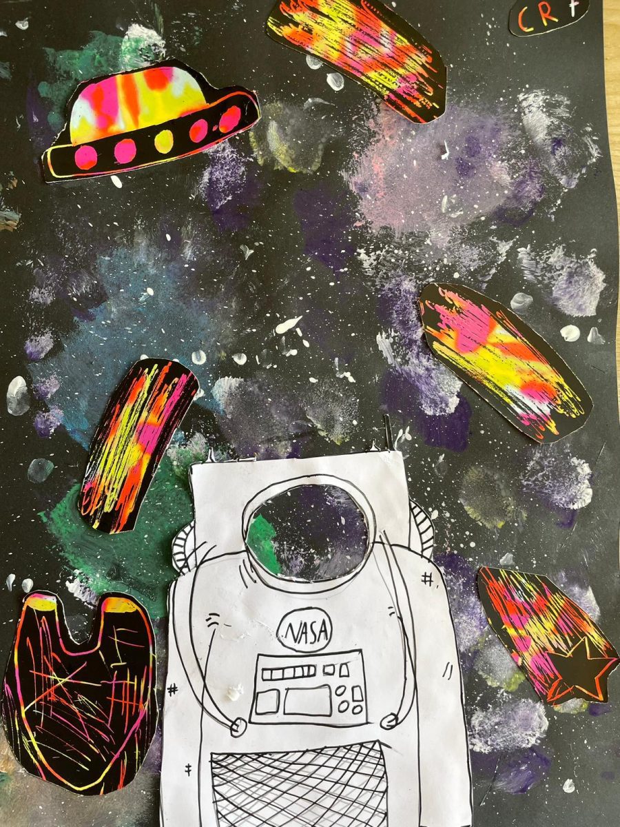 The children chose this art for their end of year art lesson and they came out so well. They drew their astronauts first and then used sponges to create the different colour galaxies and stars on the black background. They used rainbow scratch paper to create various objects that you might find in space, very cool!