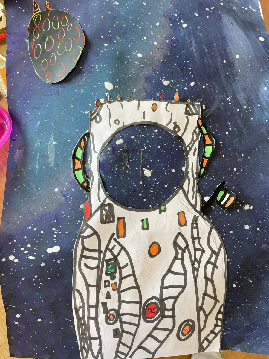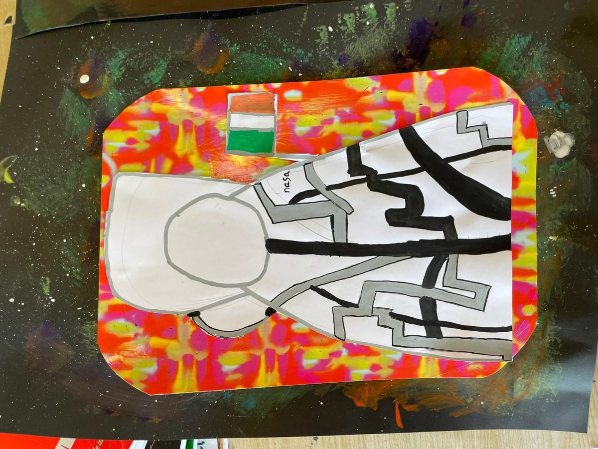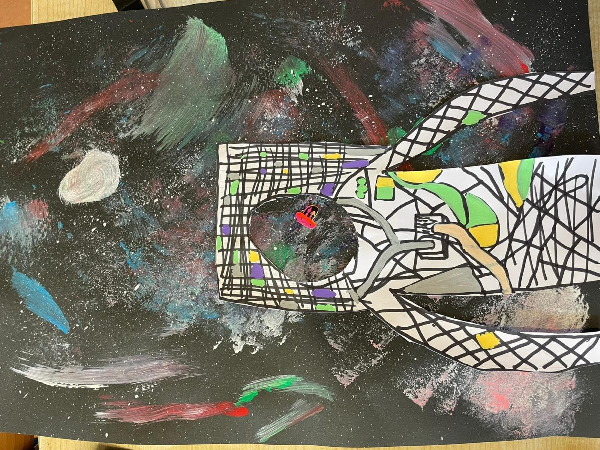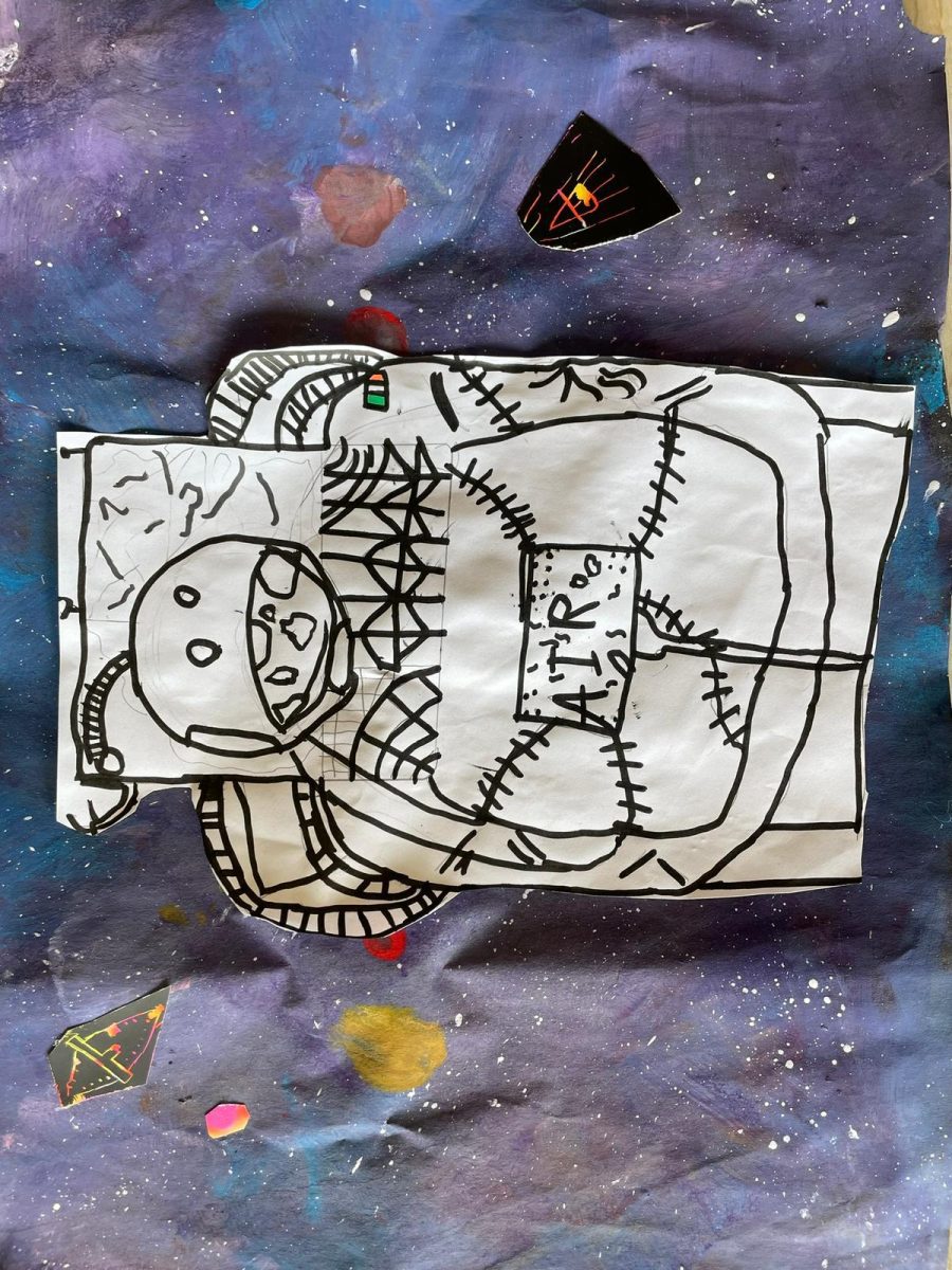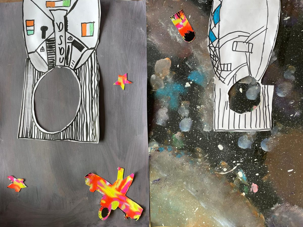 The children chose this art for their end of year art lesson and they came out so well. They drew their astronauts first and then used sponges to create the different colour galaxies and stars on the black background. They used rainbow scratch paper to create various objects that you might find in space, very cool!