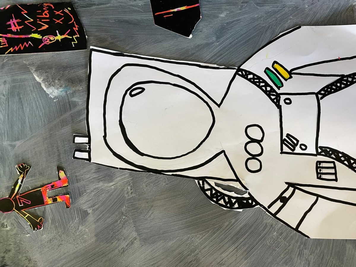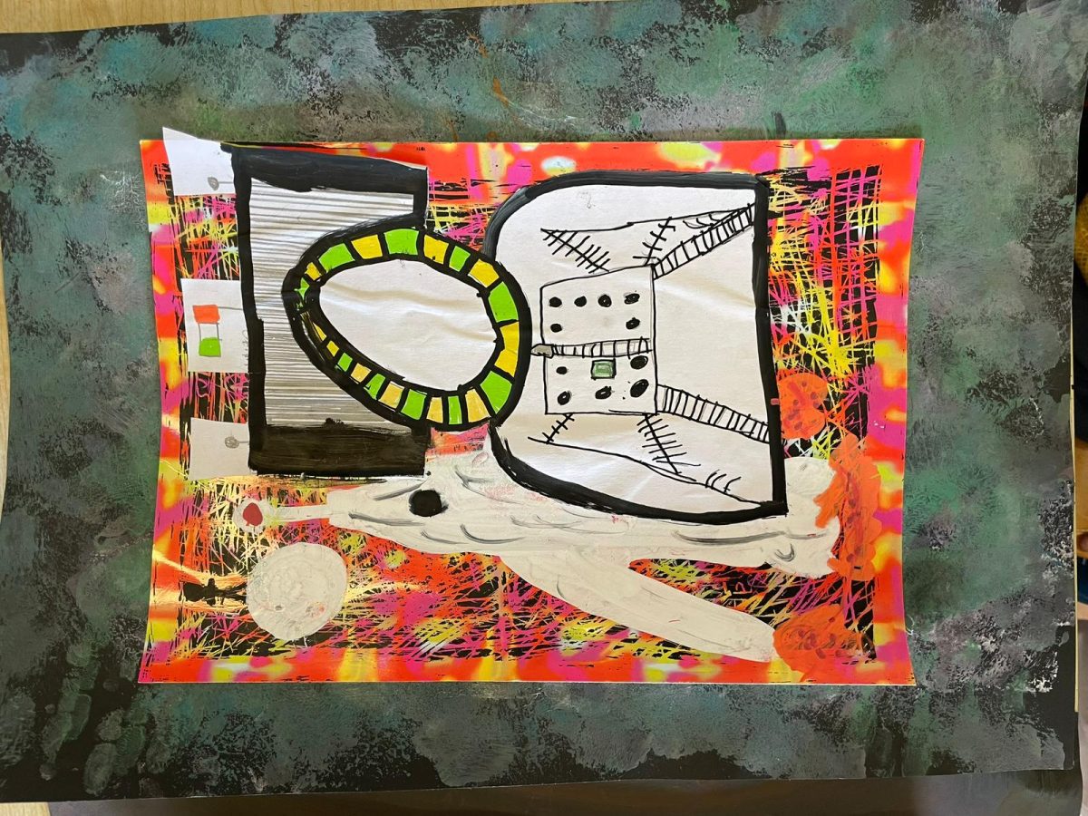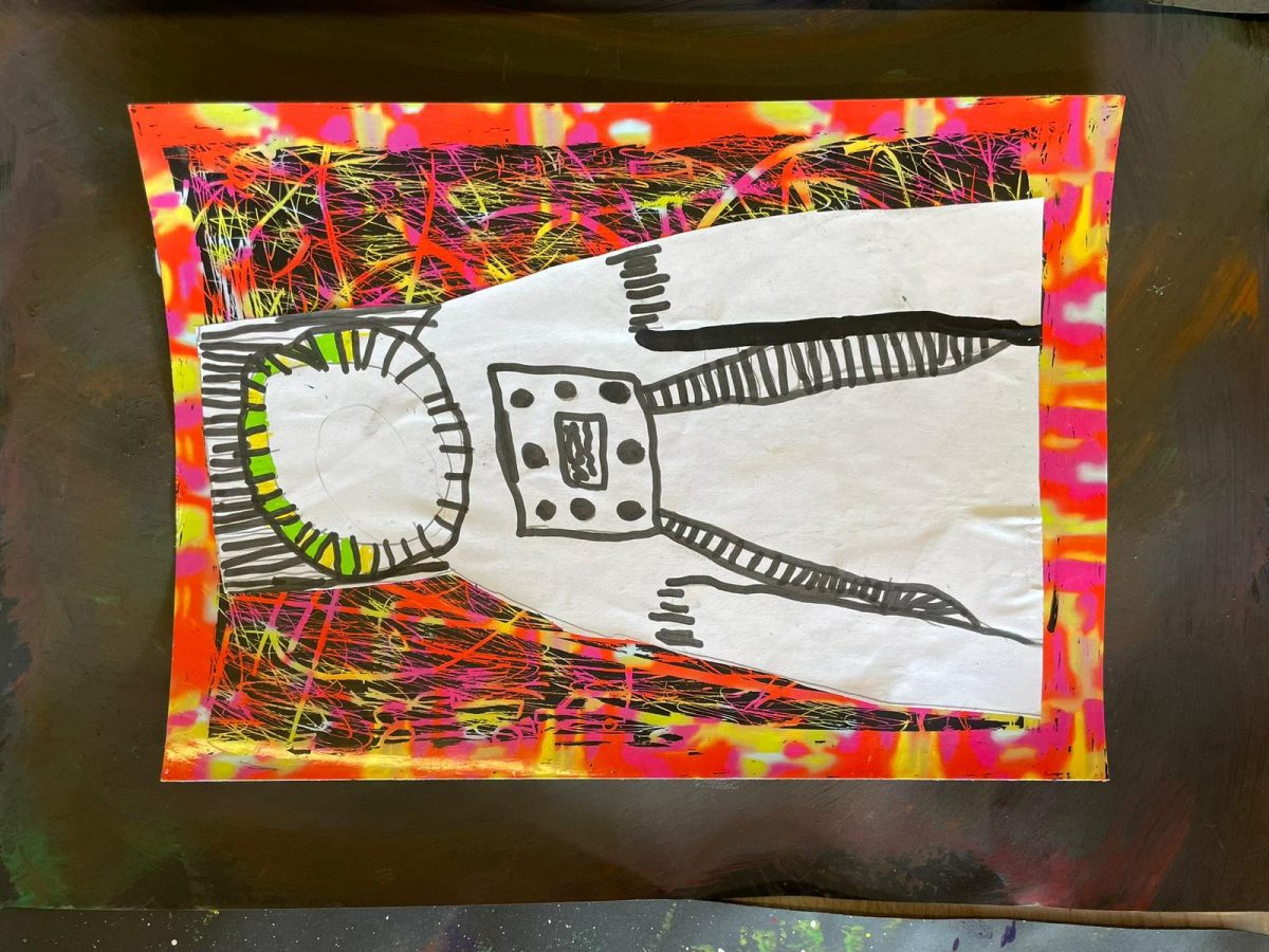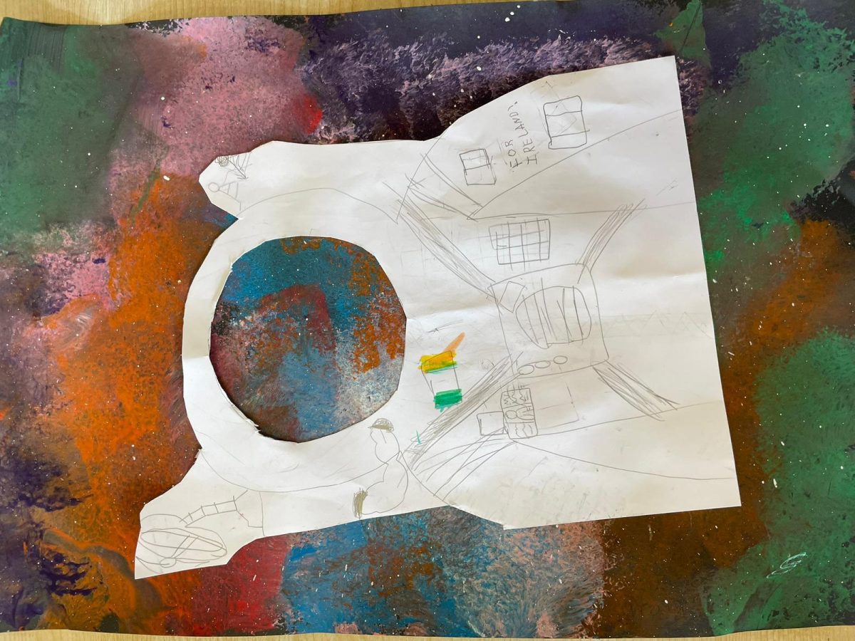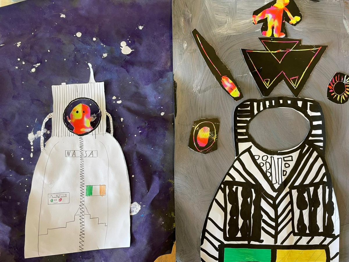 The children chose this art for their end of year art lesson and they came out so well. They drew their astronauts first and then used sponges to create the different colour galaxies and stars on the black background. They used rainbow scratch paper to create various objects that you might find in space, very cool!