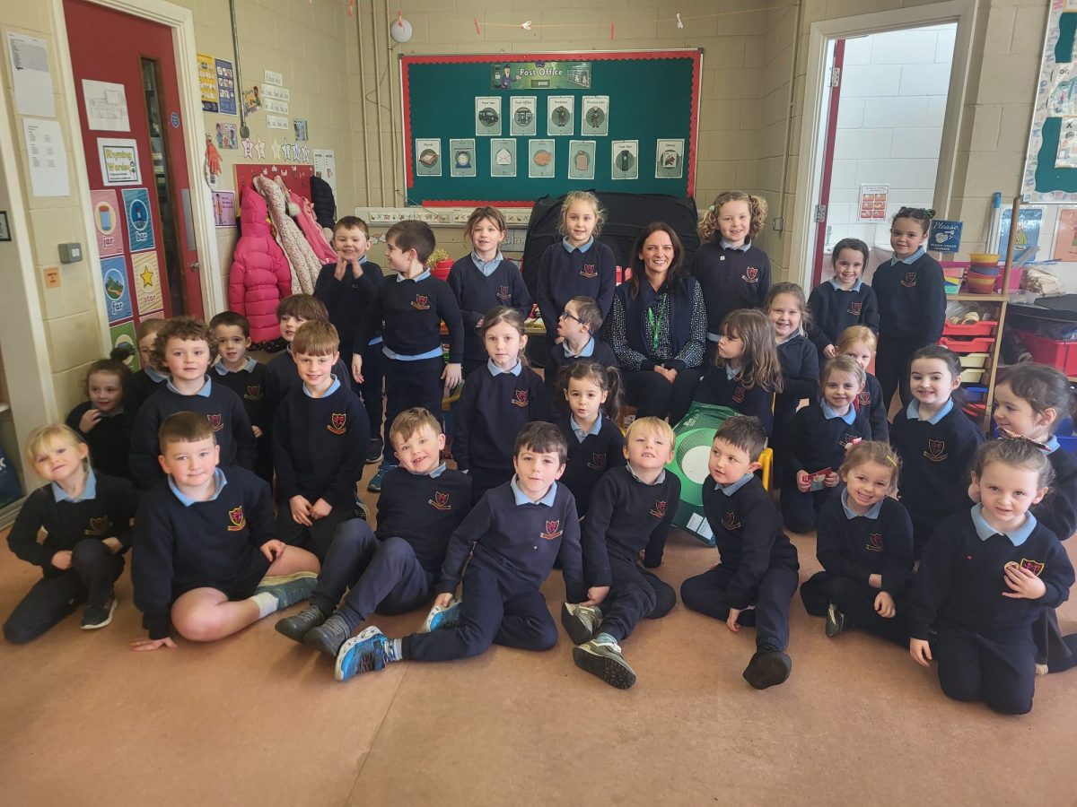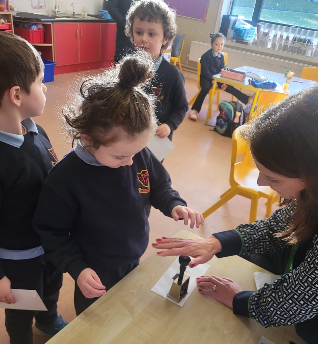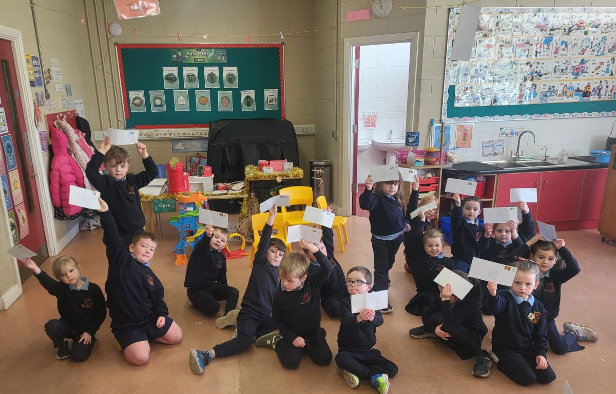 We were lucky to have Post Office clerk Marion in to visit junior and senior infants. The children got to stamp their own envelopes addressed to them. They will eagerly await the delivery.