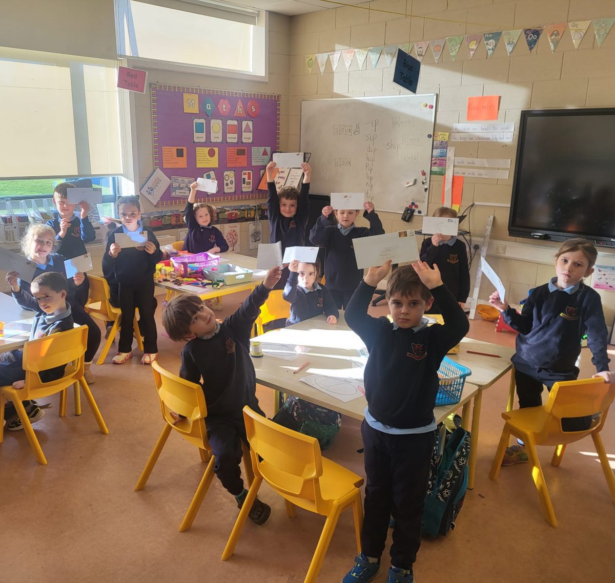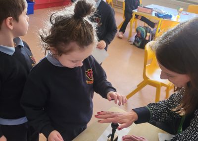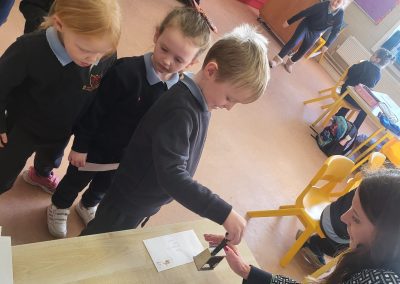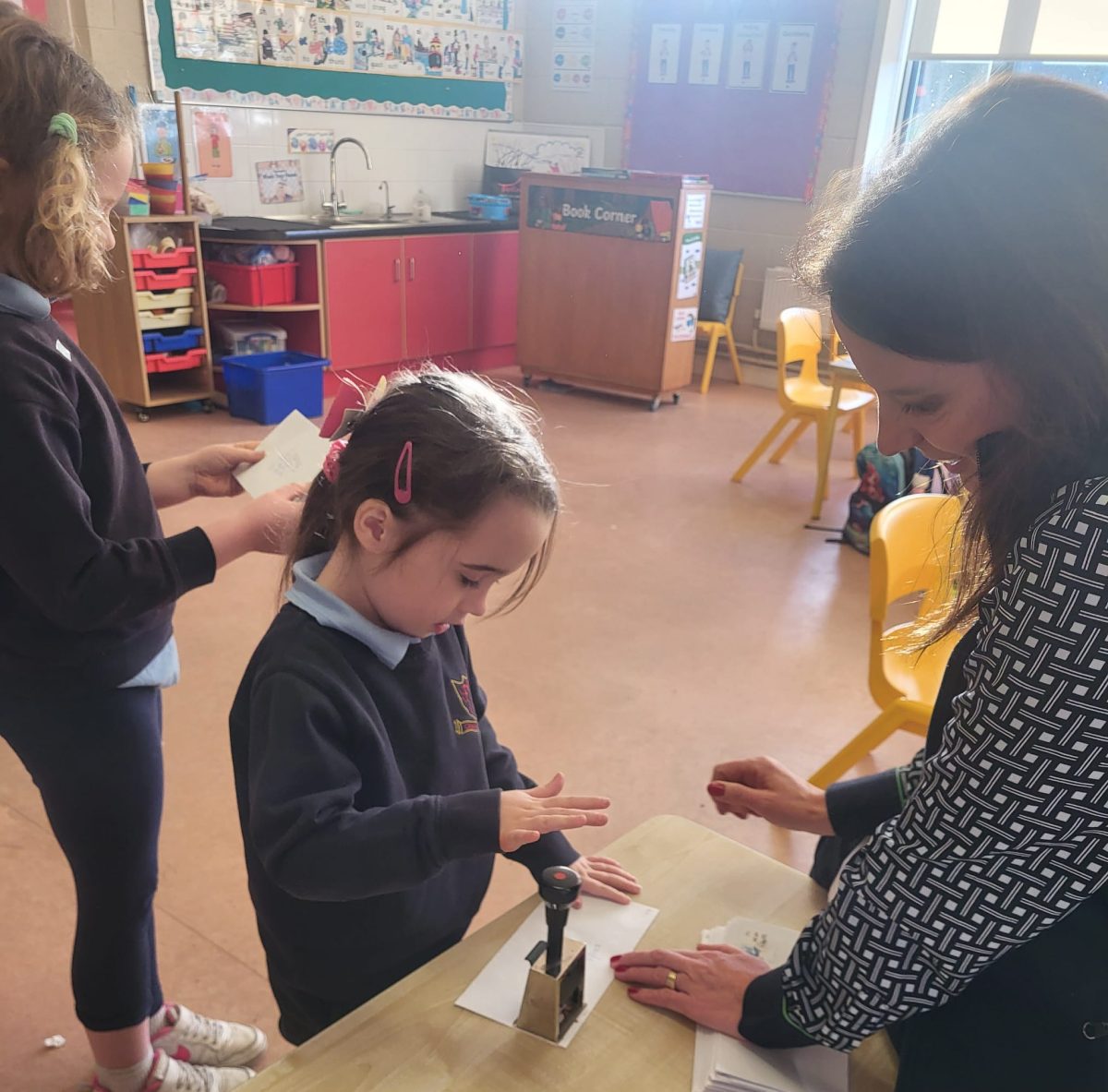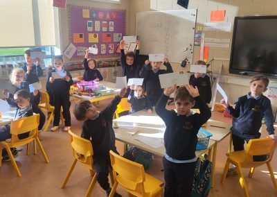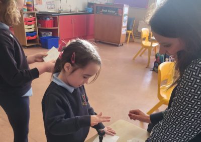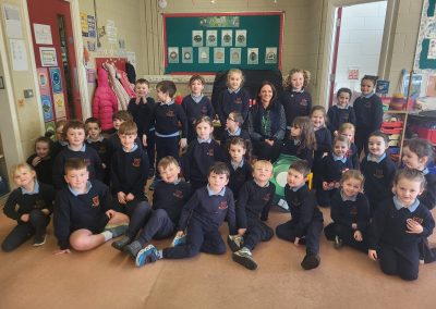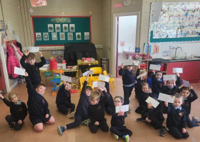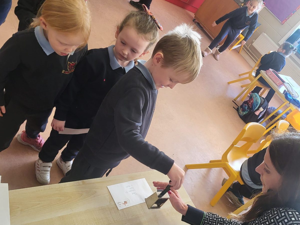 We were lucky to have Post Office clerk Marion in to visit junior and senior infants. The children got to stamp their own envelopes addressed to them. They will eagerly await the delivery.