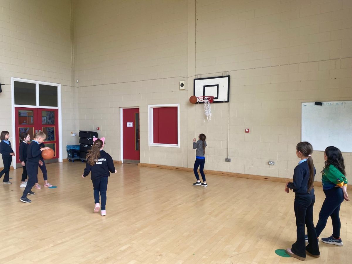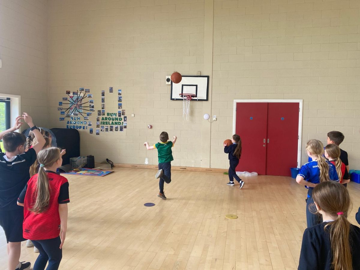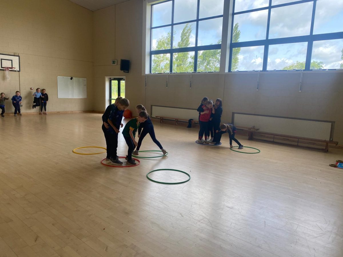 Some photos of 2nd class during Active week including basketball from coach Alex. Daily active challenge of crossing the sports hall using hula hoops.