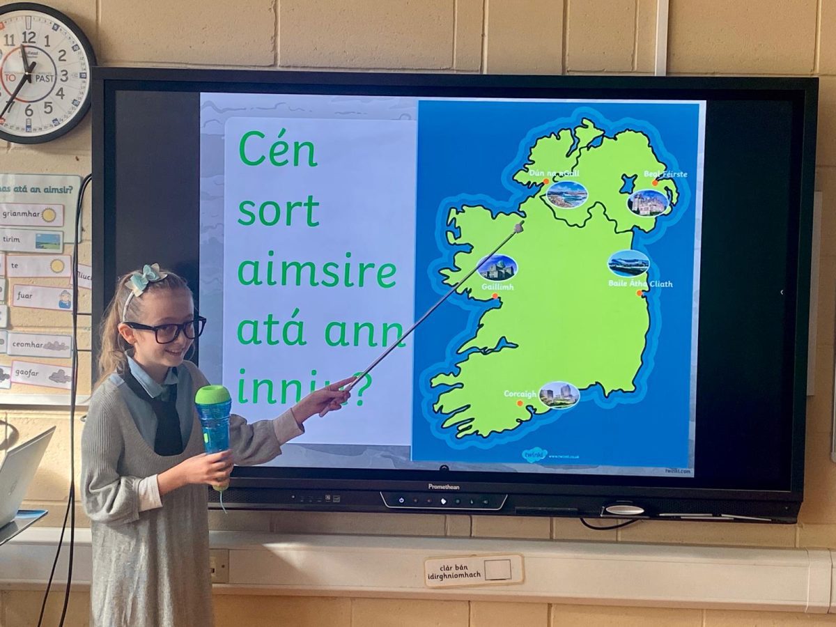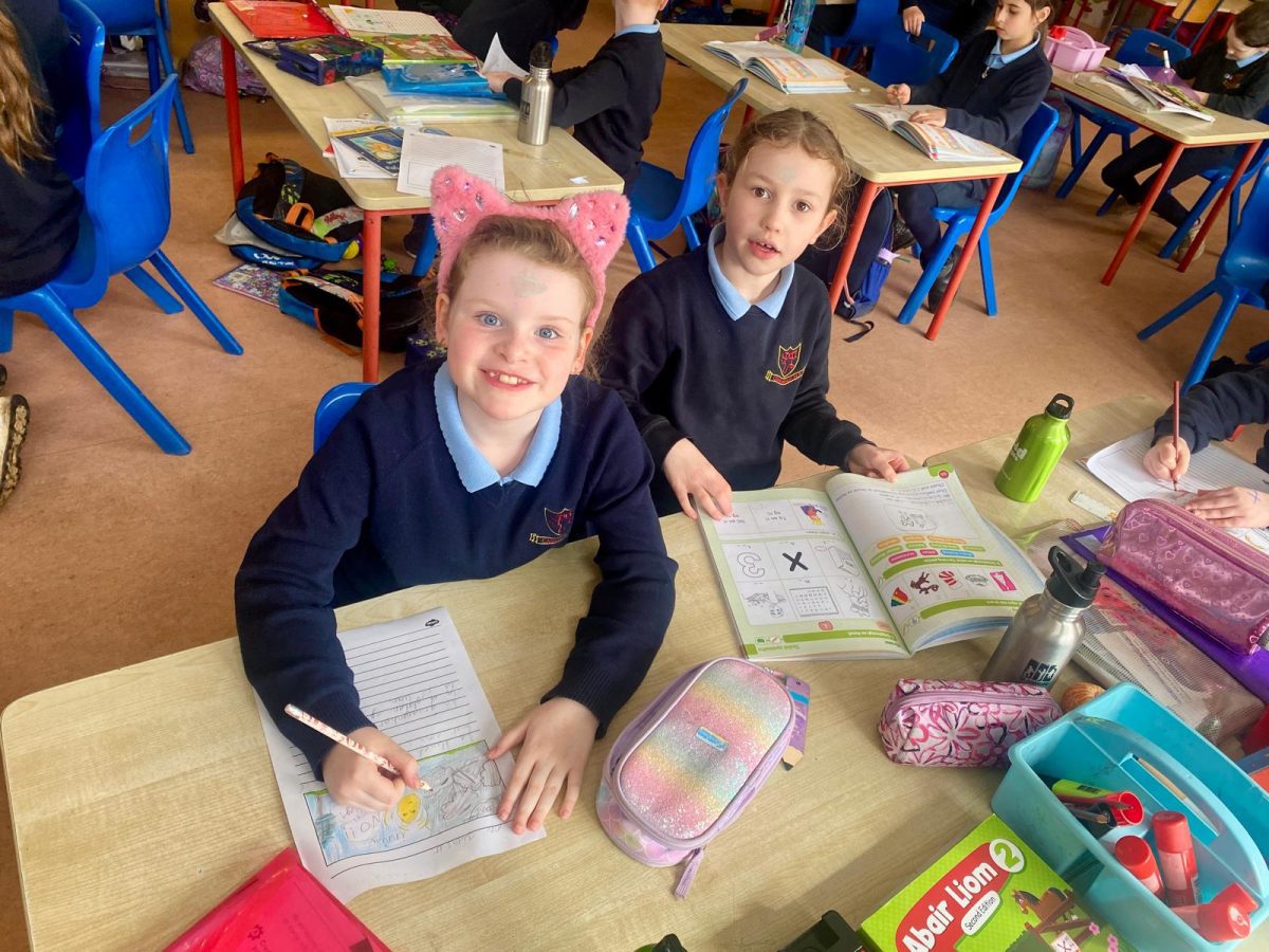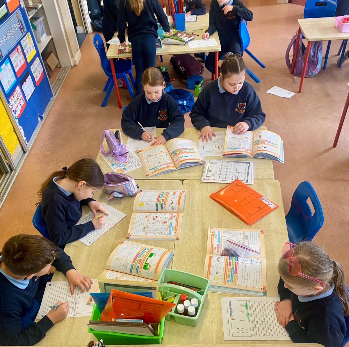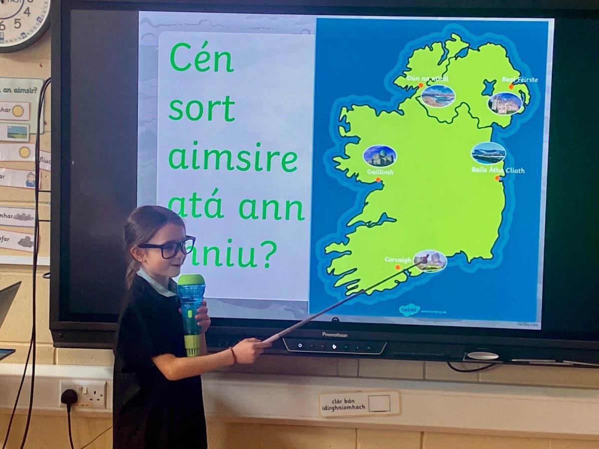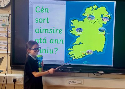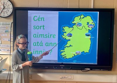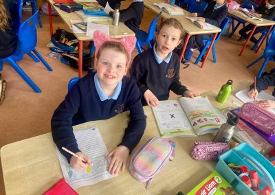 Second Class working on both oral and written work on the Irish topic of An Aimsir