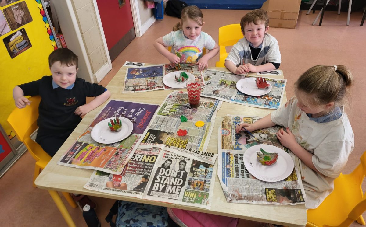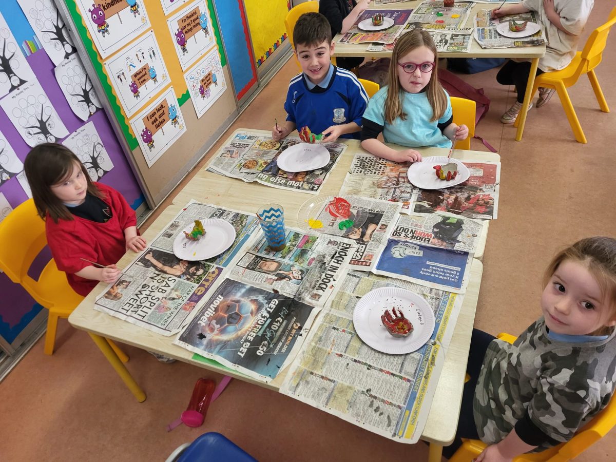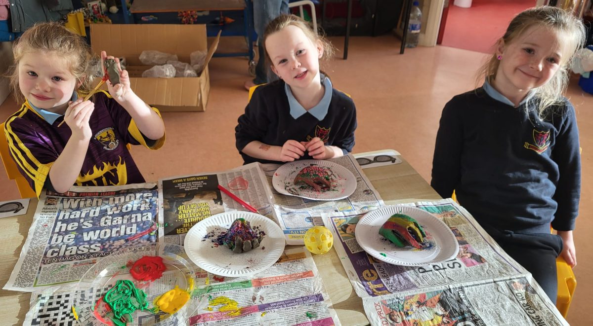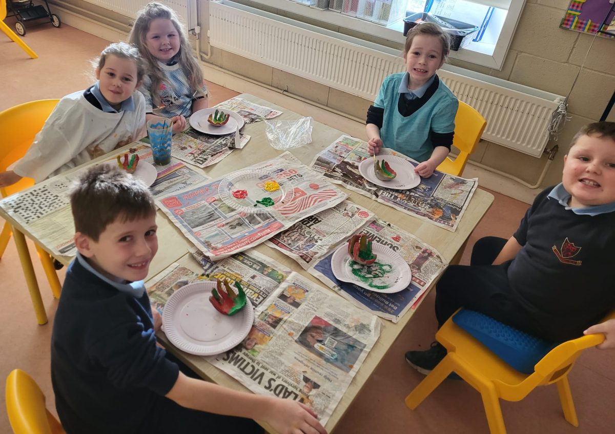 Senior Infants had fun exploring with clay to make jewellery holders for the Clonmellon Christmas market. They also painted them in Christmas themed colours.