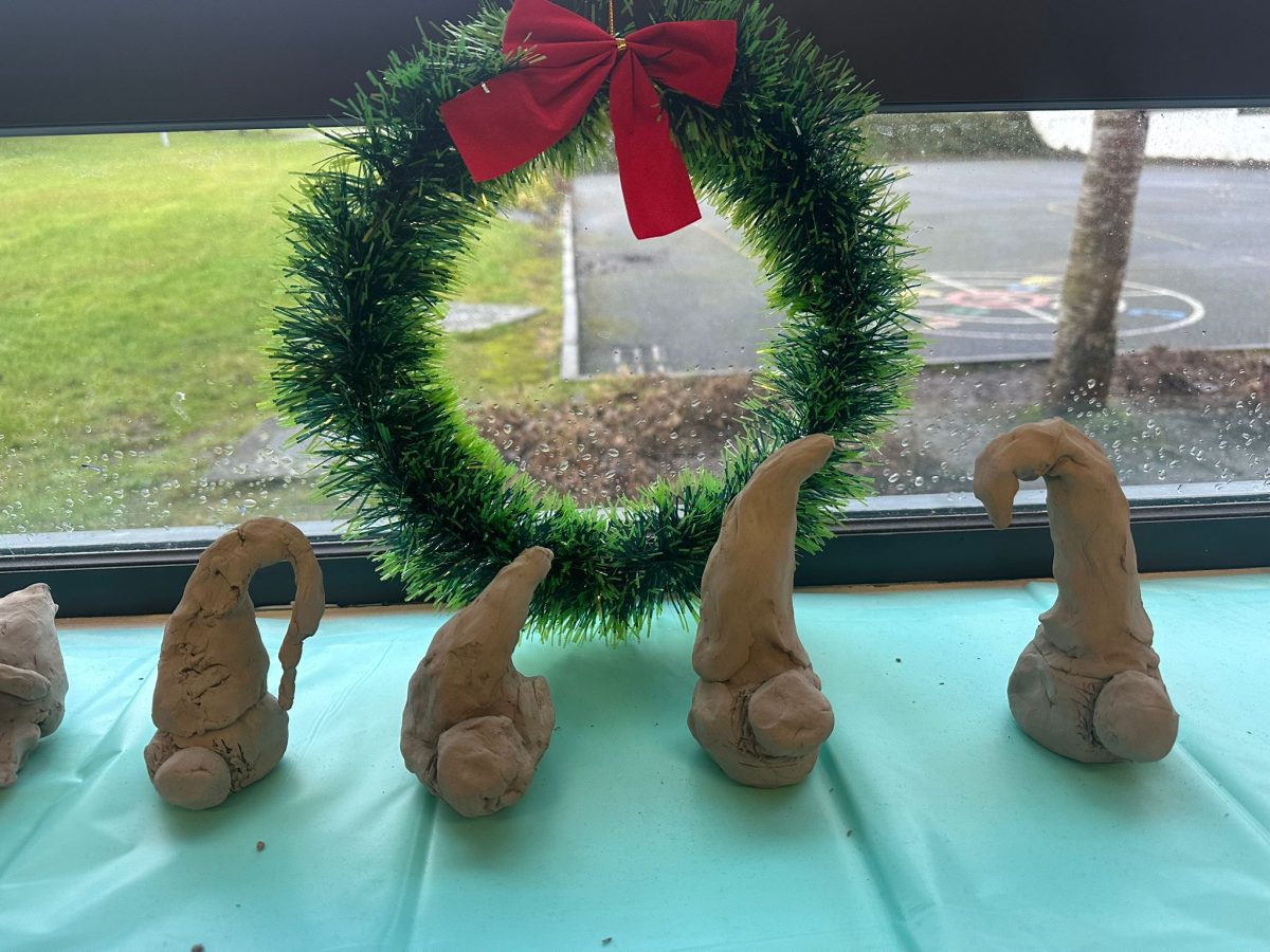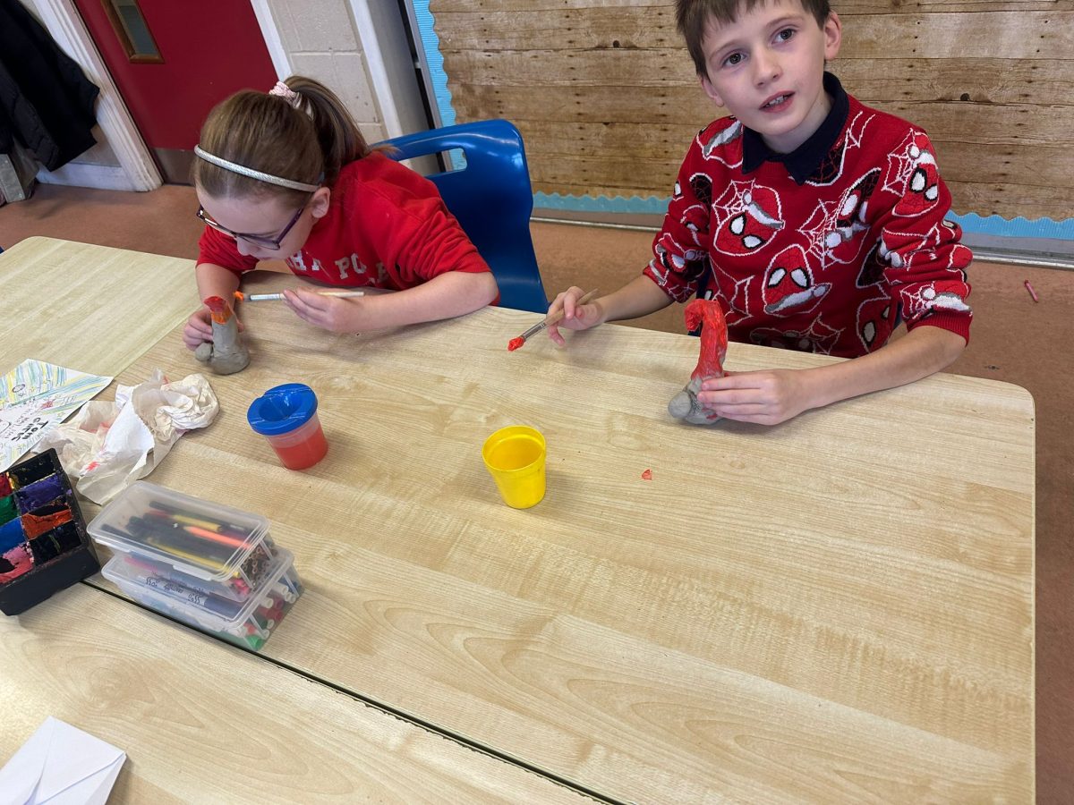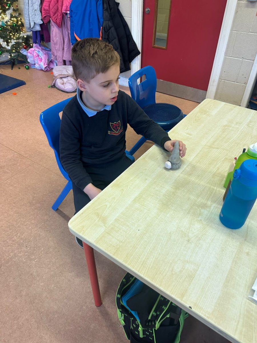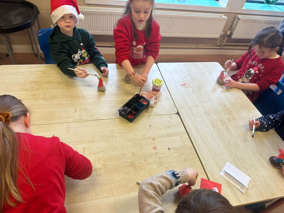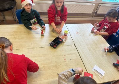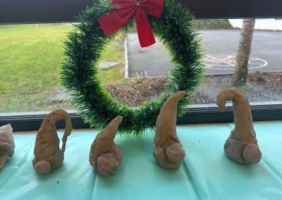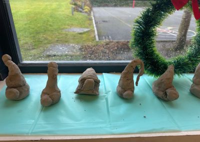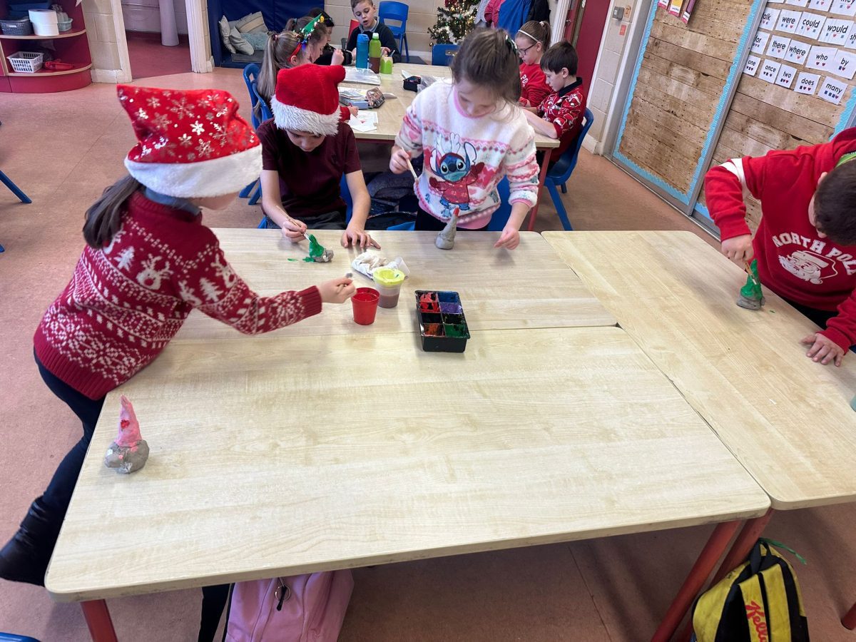 A mixture of photos of December in 1st Class. Photos of the raffle, Christmas jumper day and for Christmas art we made Christmas gonks using clay and then some paintings.