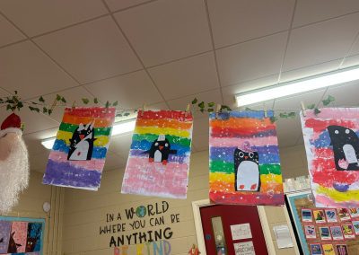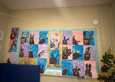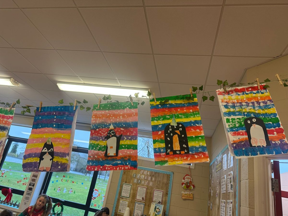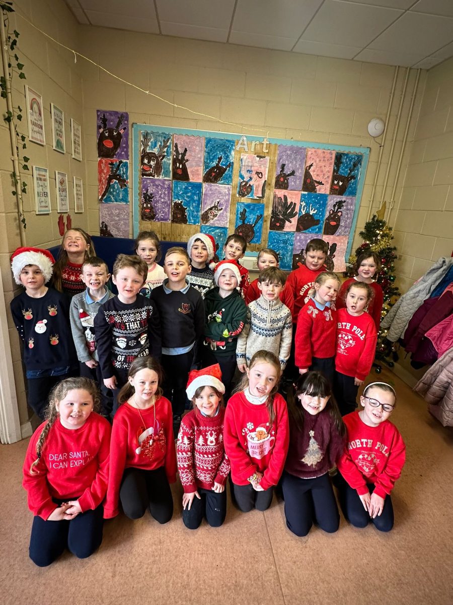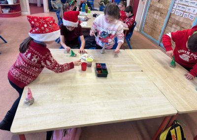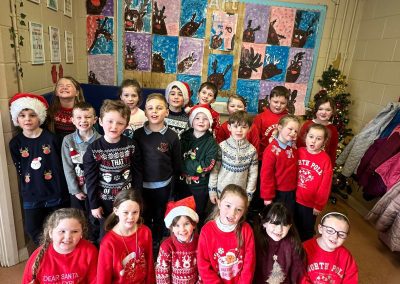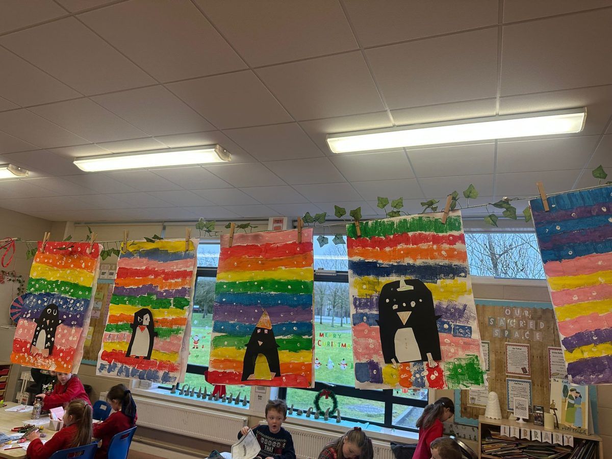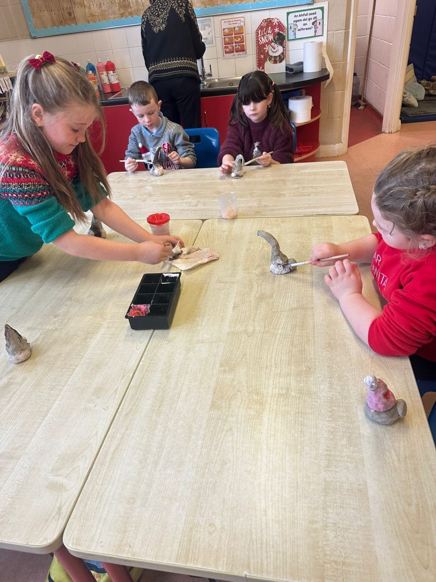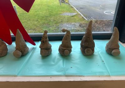 A mixture of photos of December in 1st Class. Photos of the raffle, Christmas jumper day and for Christmas art we made Christmas gonks using clay and then some paintings.
