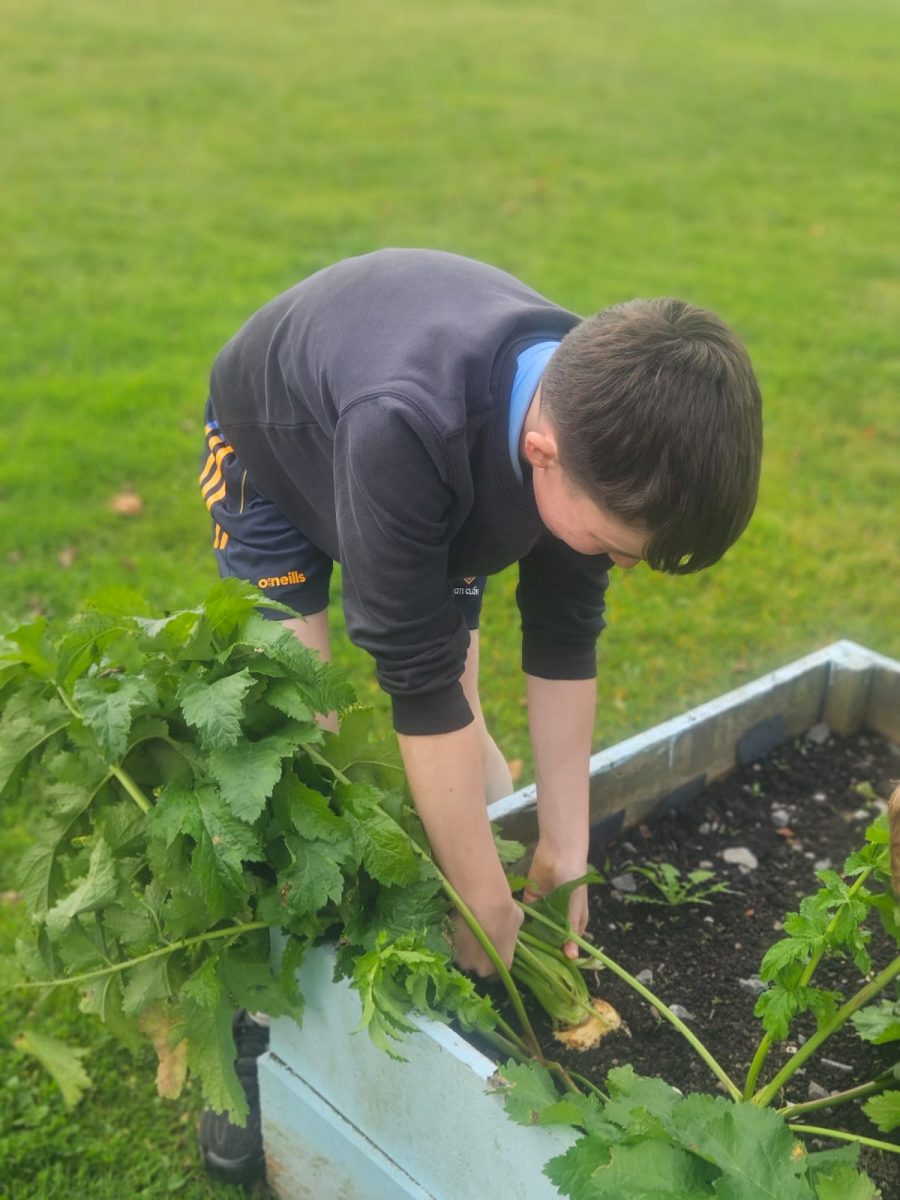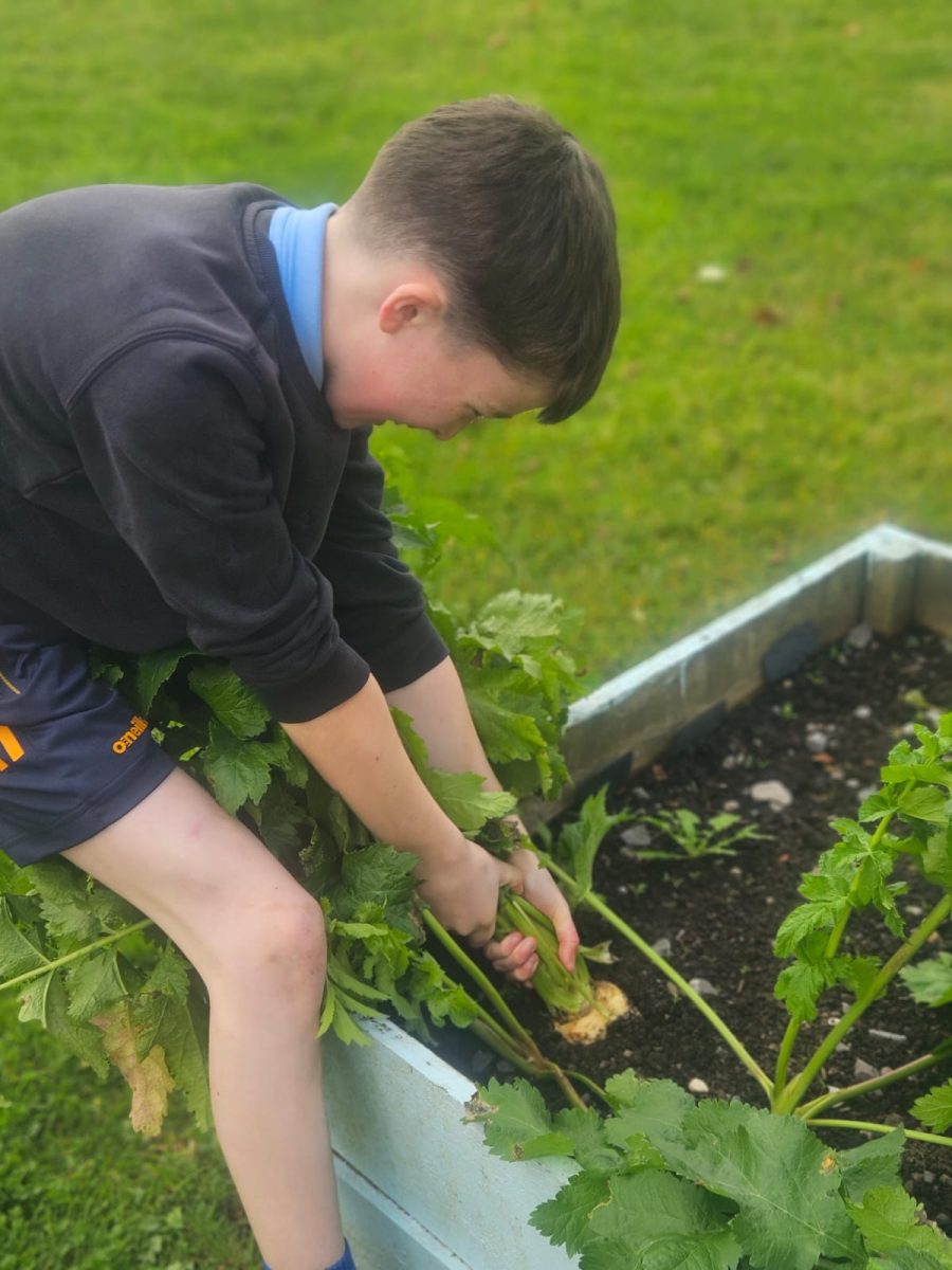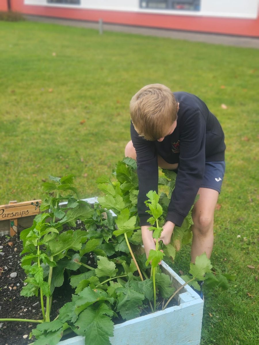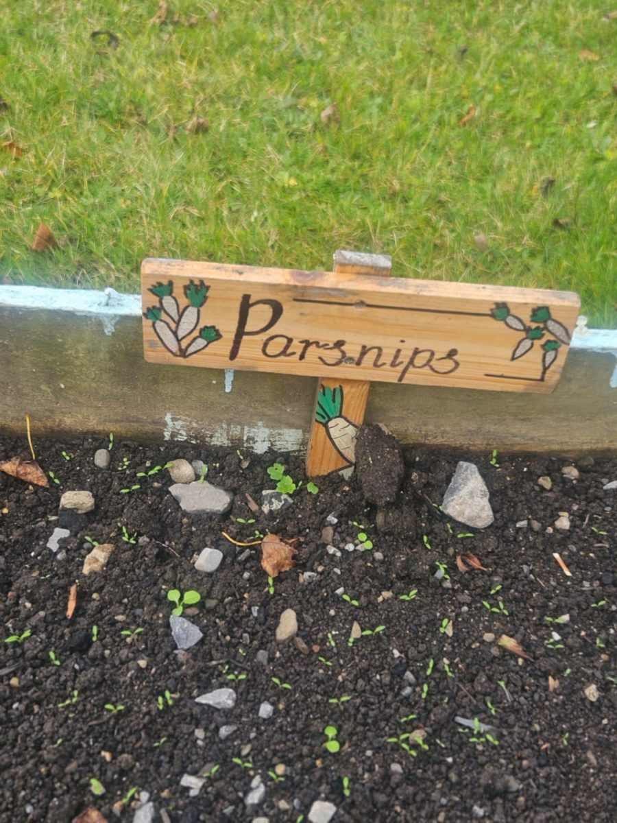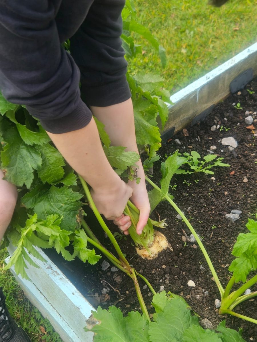 Our garden team harvesting the last of our vegetables, our parsnips. One in particular proved to be a big one and we had lots of laughs seeing who had the muscle to pull it out! The jury is out on who actually succeeded in its retrieval, this it was a group effort!