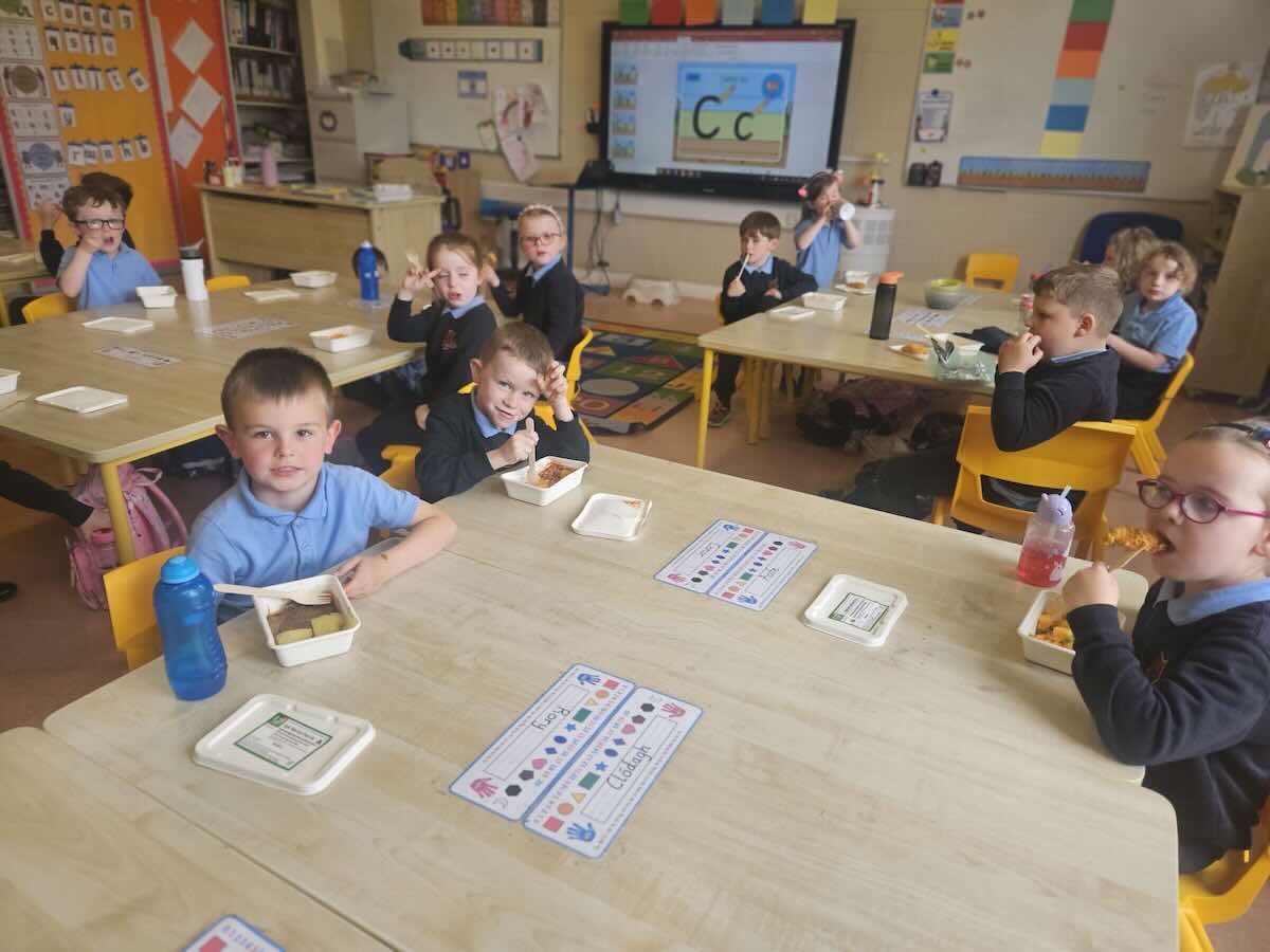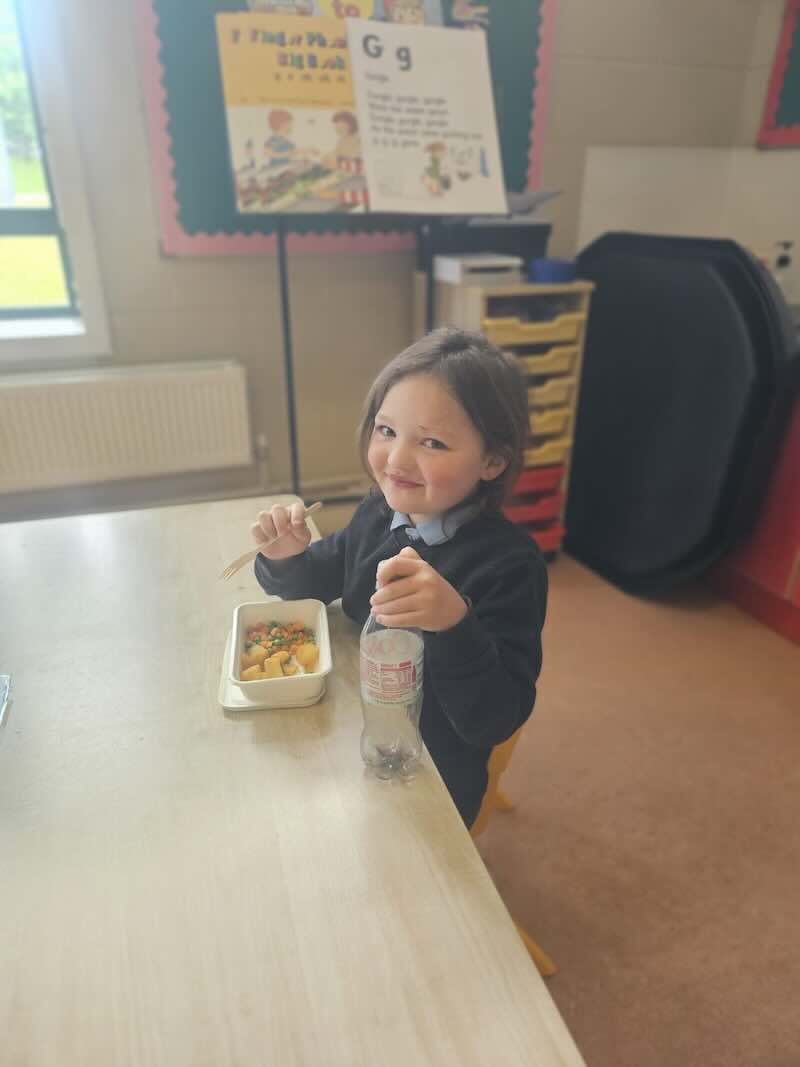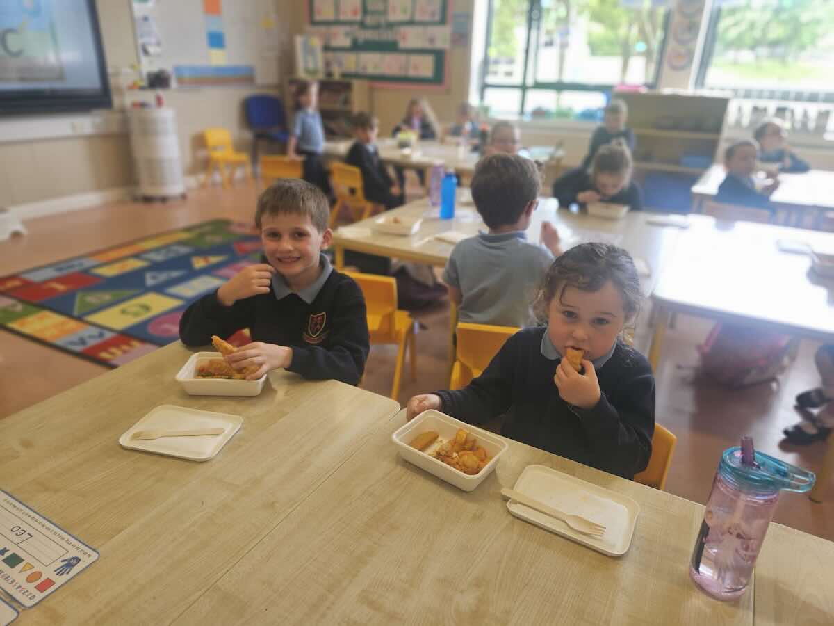 The children in junior infants gave a thumbs up to the hot food they have been getting in school for the past week. There are lots of different food options and the children seemed very happy with their choices.