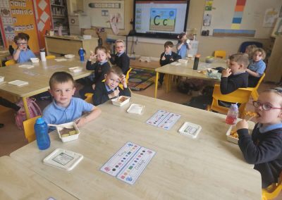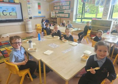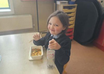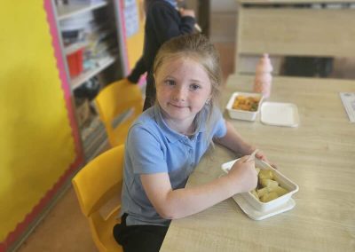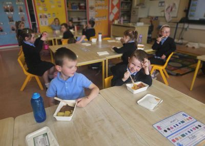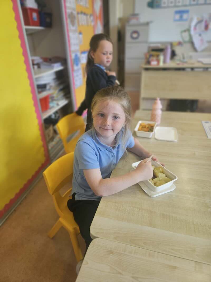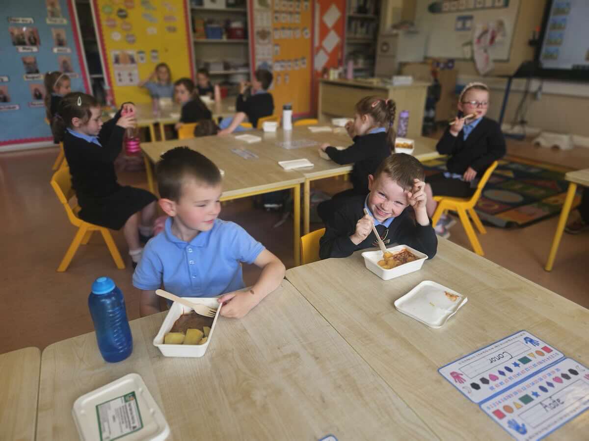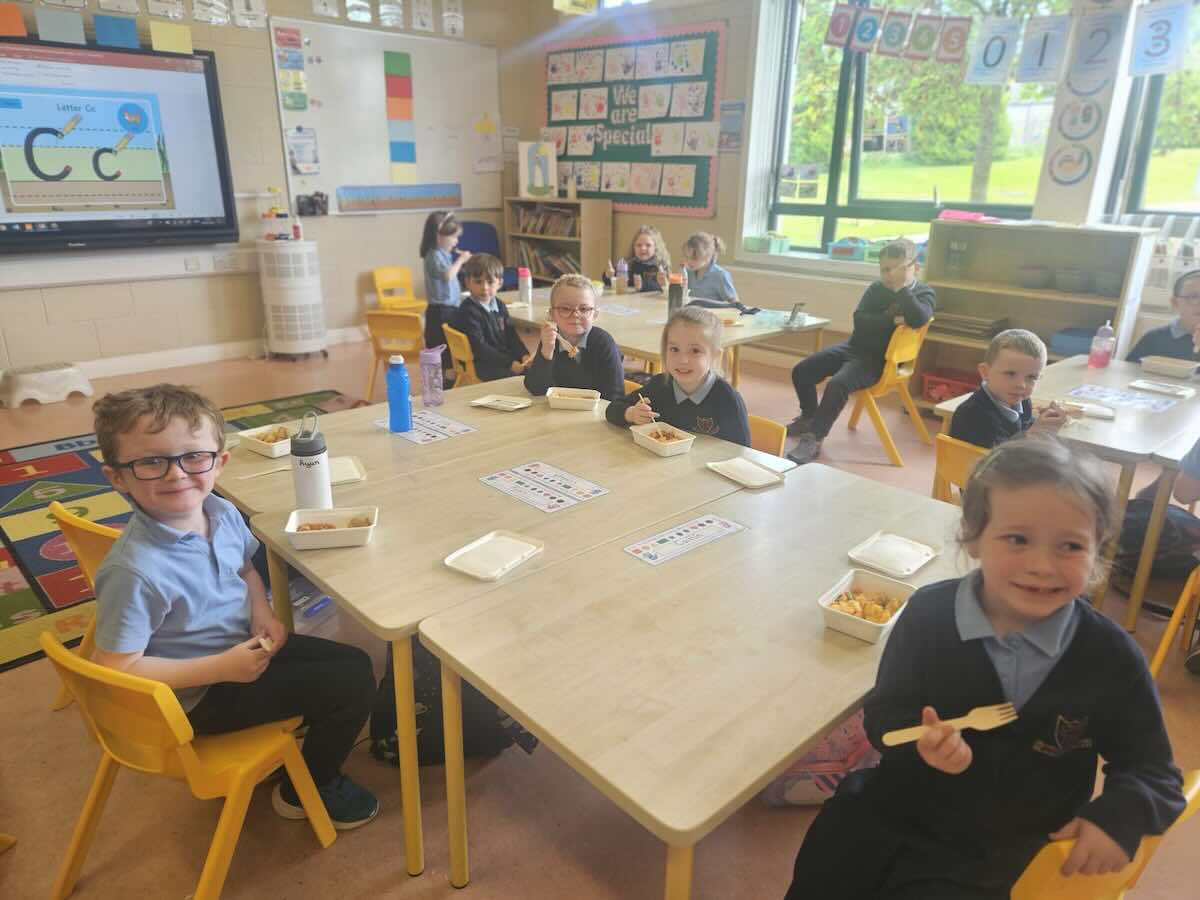 The children in junior infants gave a thumbs up to the hot food they have been getting in school for the past week. There are lots of different food options and the children seemed very happy with their choices.