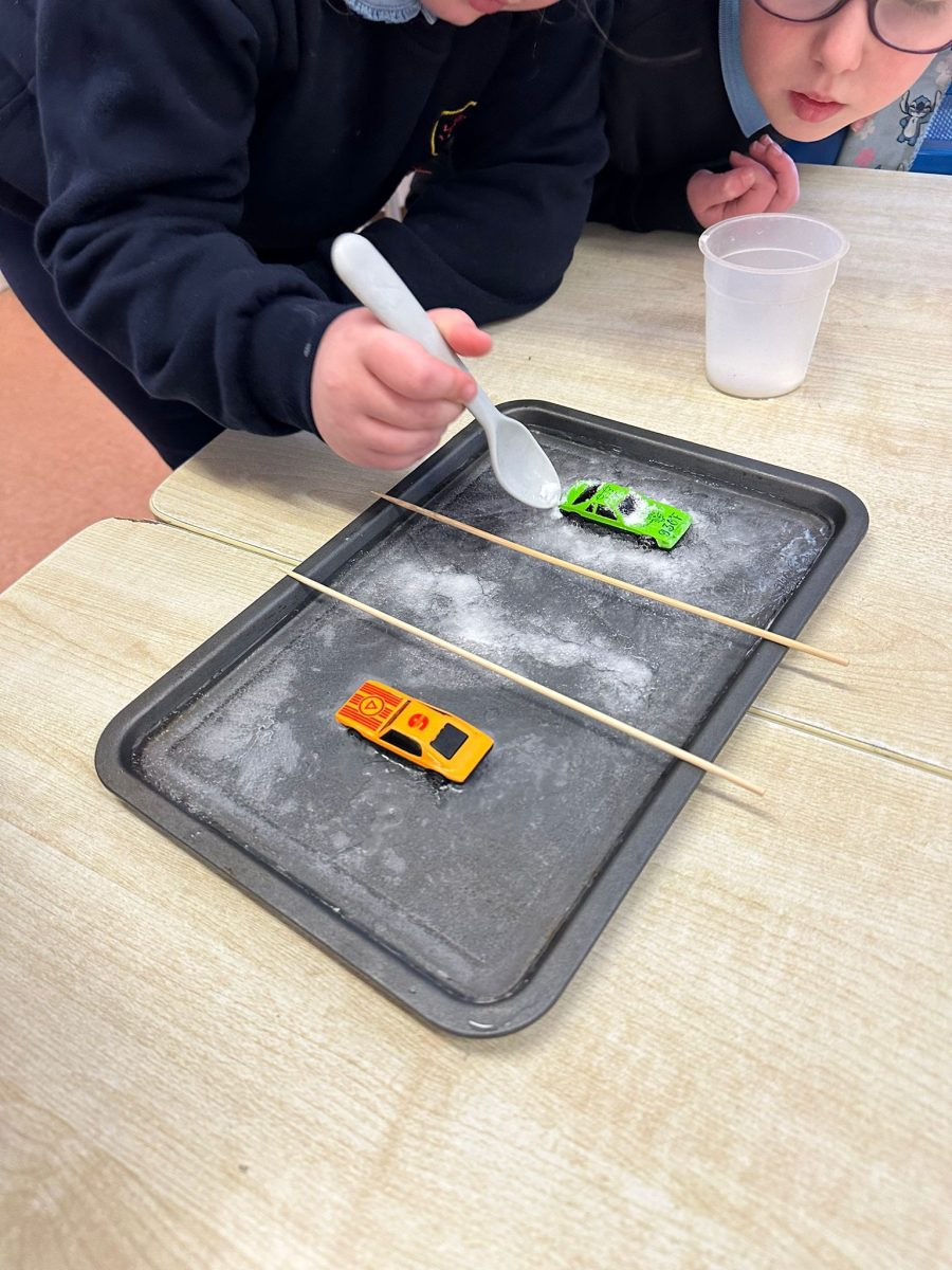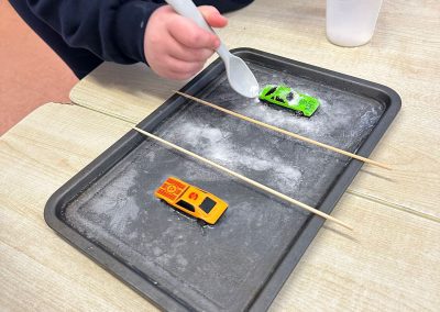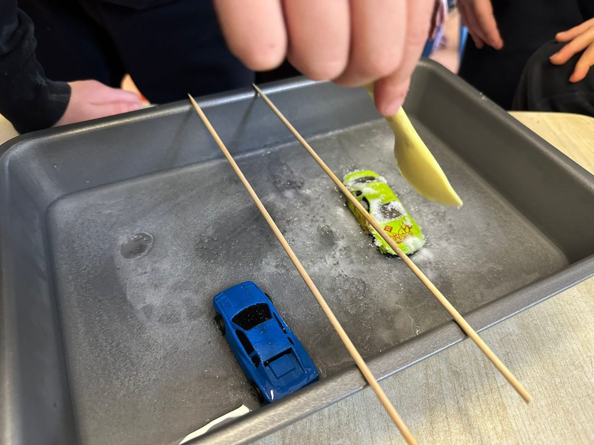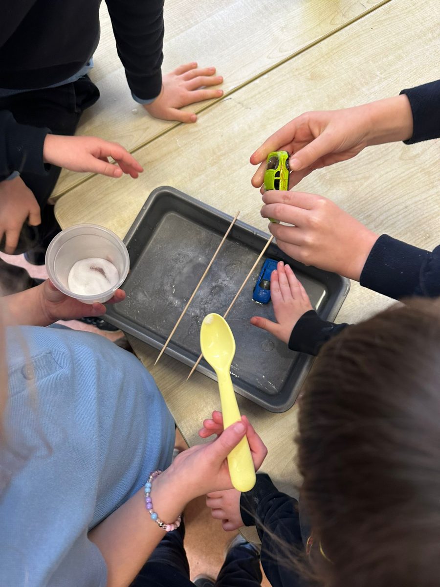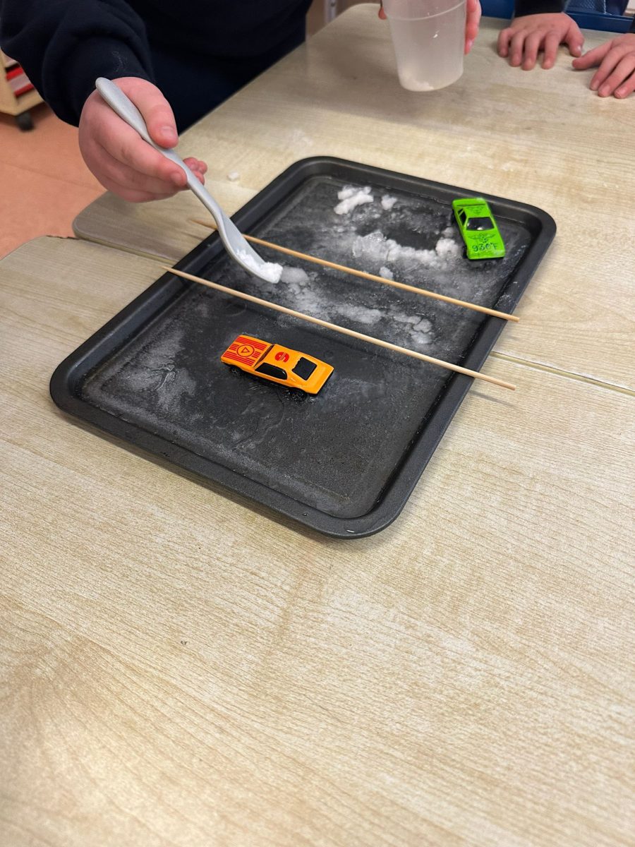Melting ice in science. The children used salt to melt the ice and free the toy car.