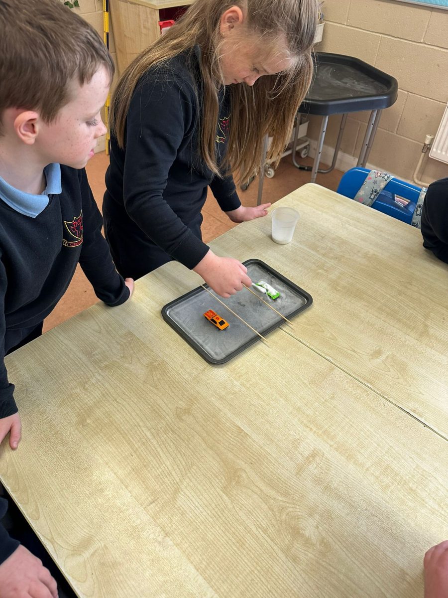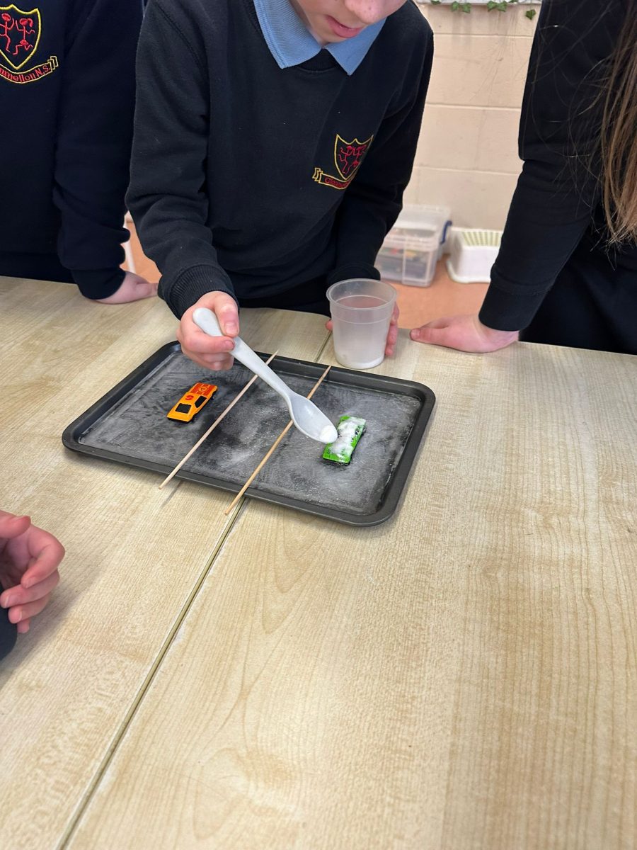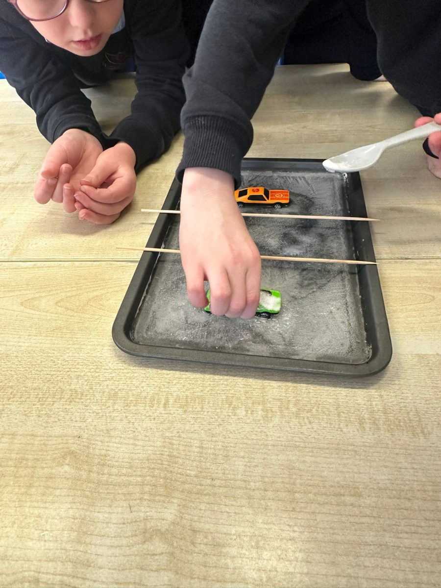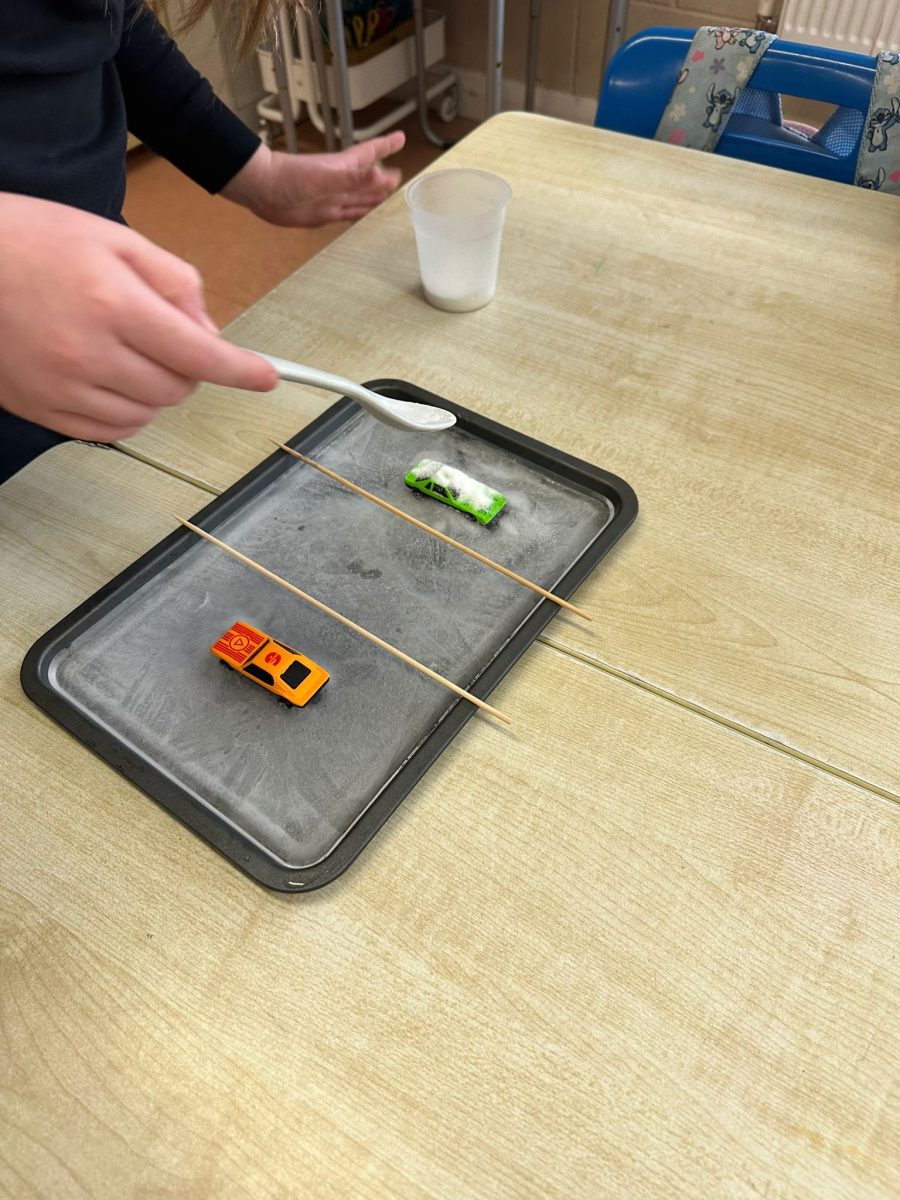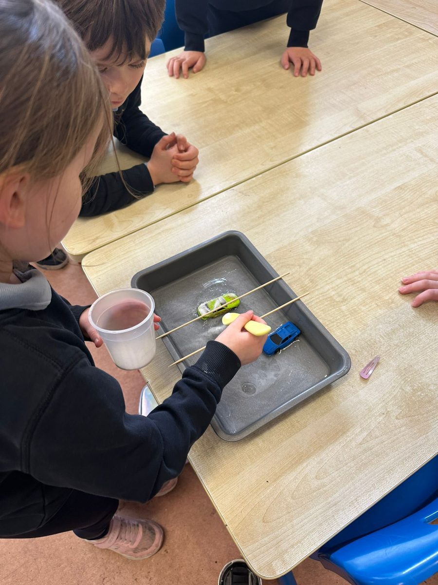 Melting ice in science. The children used salt to melt the ice and free the toy car.