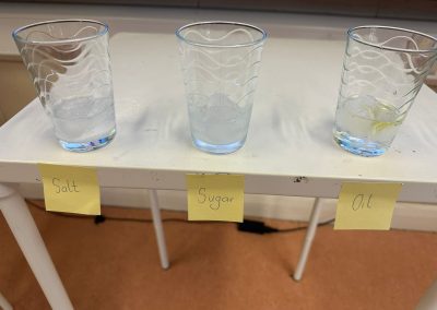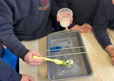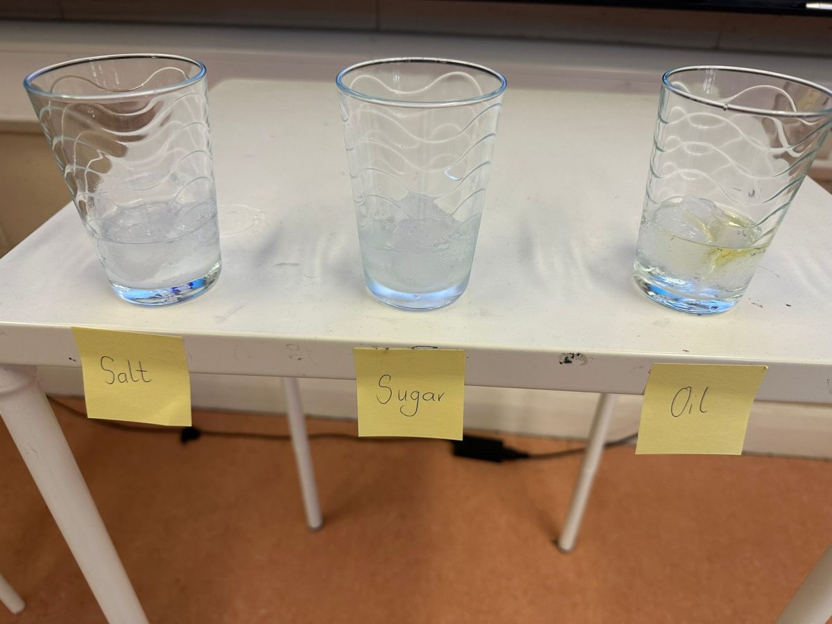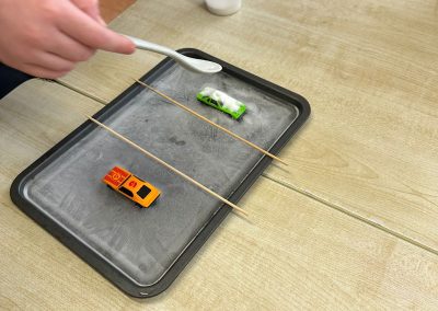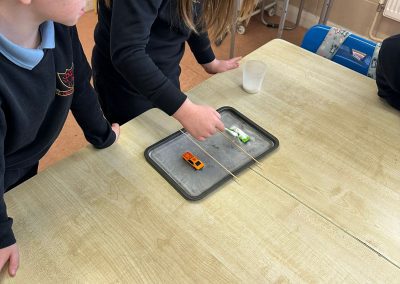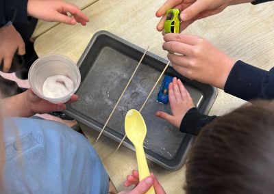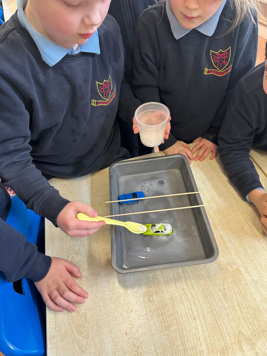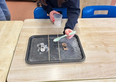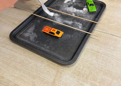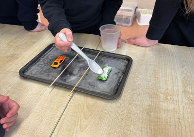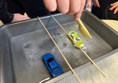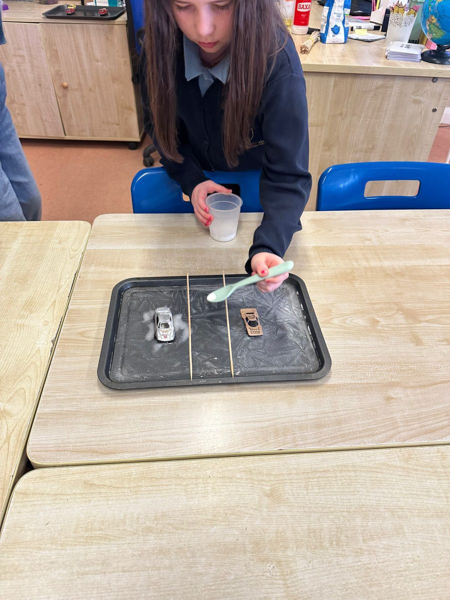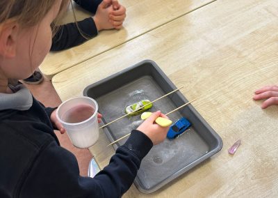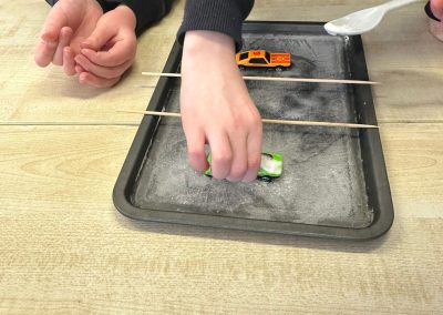 Melting ice in science. The children used salt to melt the ice and free the toy car.