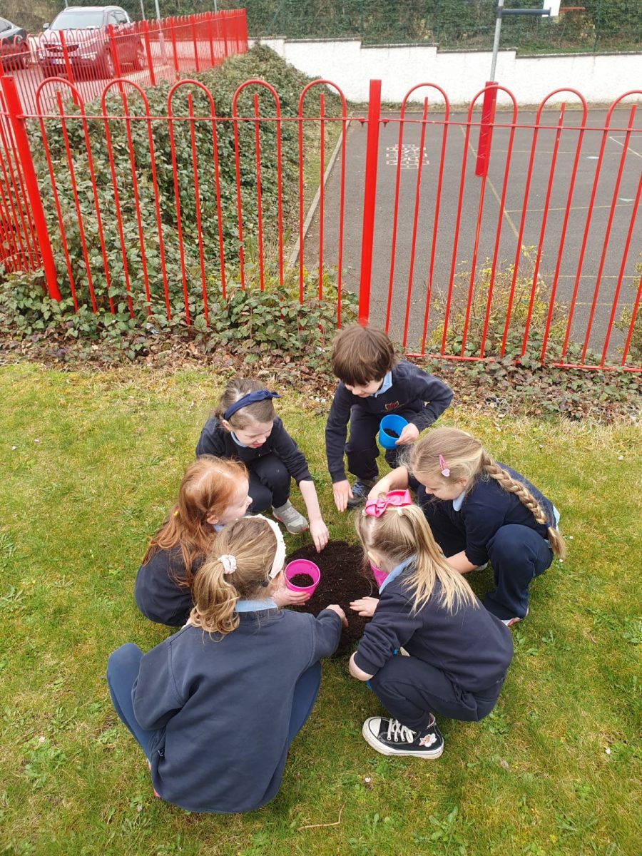Junior Infant enjoying planting flowers for their Mums on Mother’s Day.