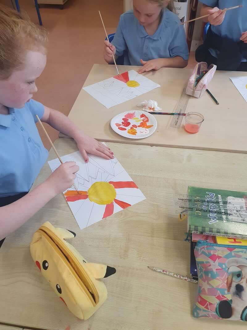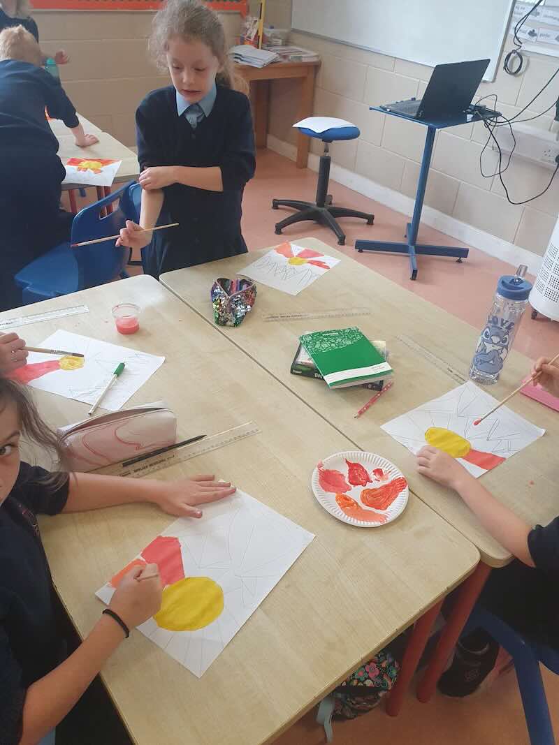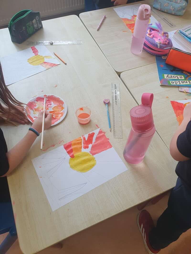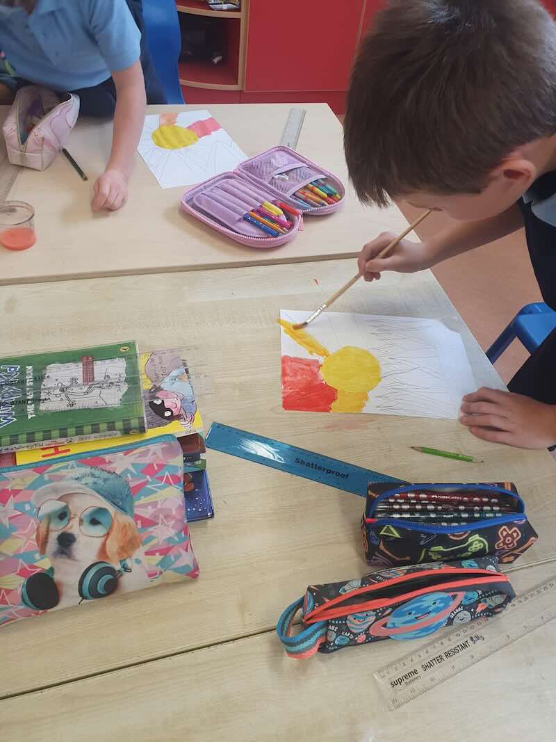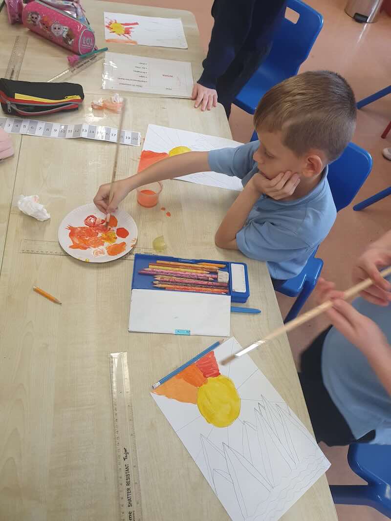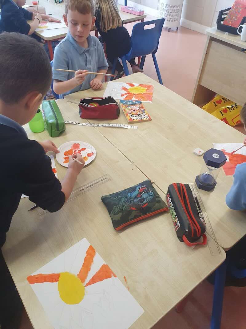 The children in 2nd class have been busy painting. They mixed up different colours to make the correct colour of the sun and created some masterpieces for the classroom wall.