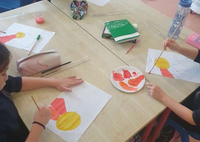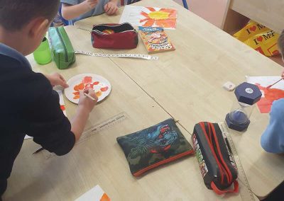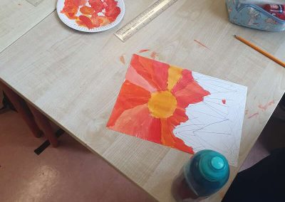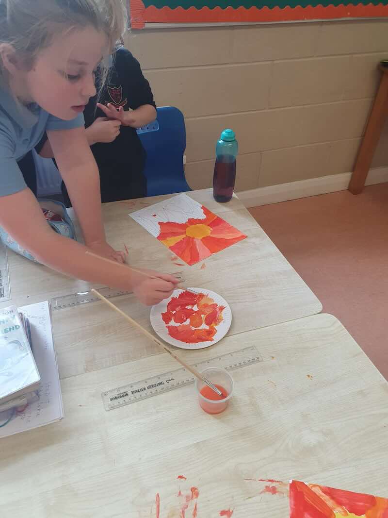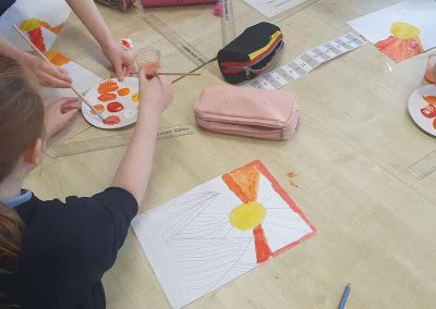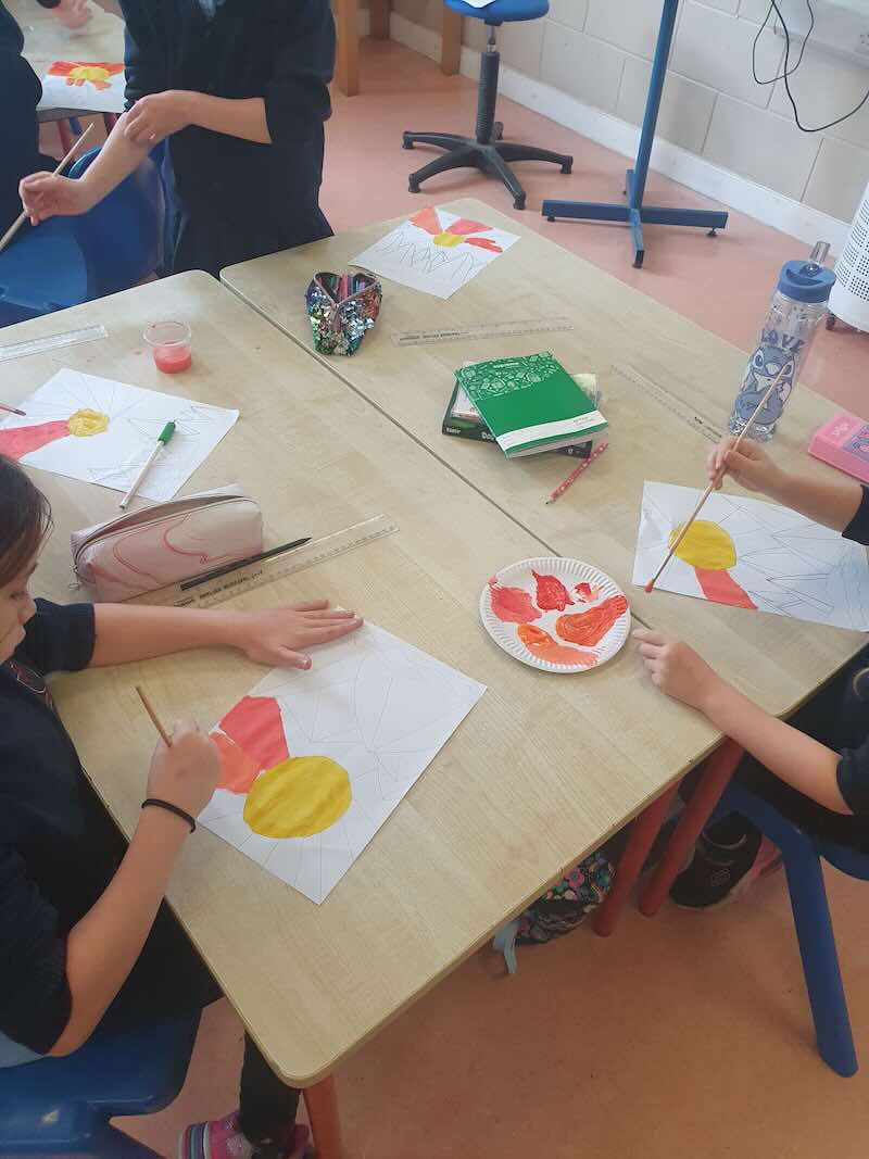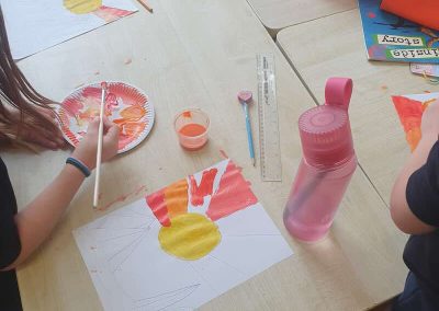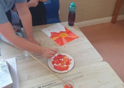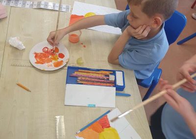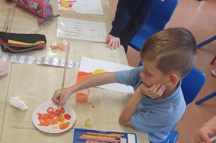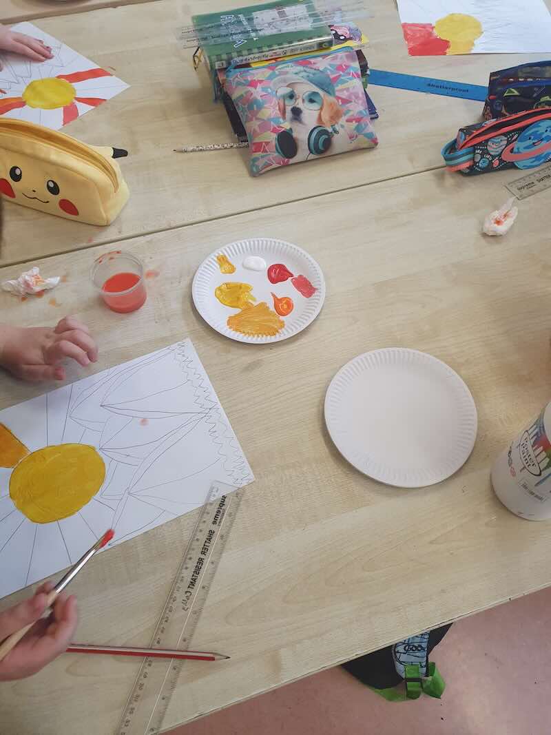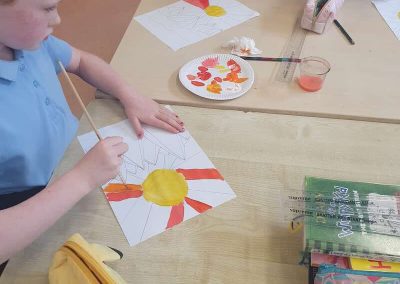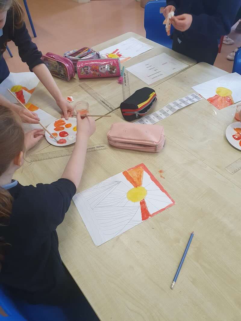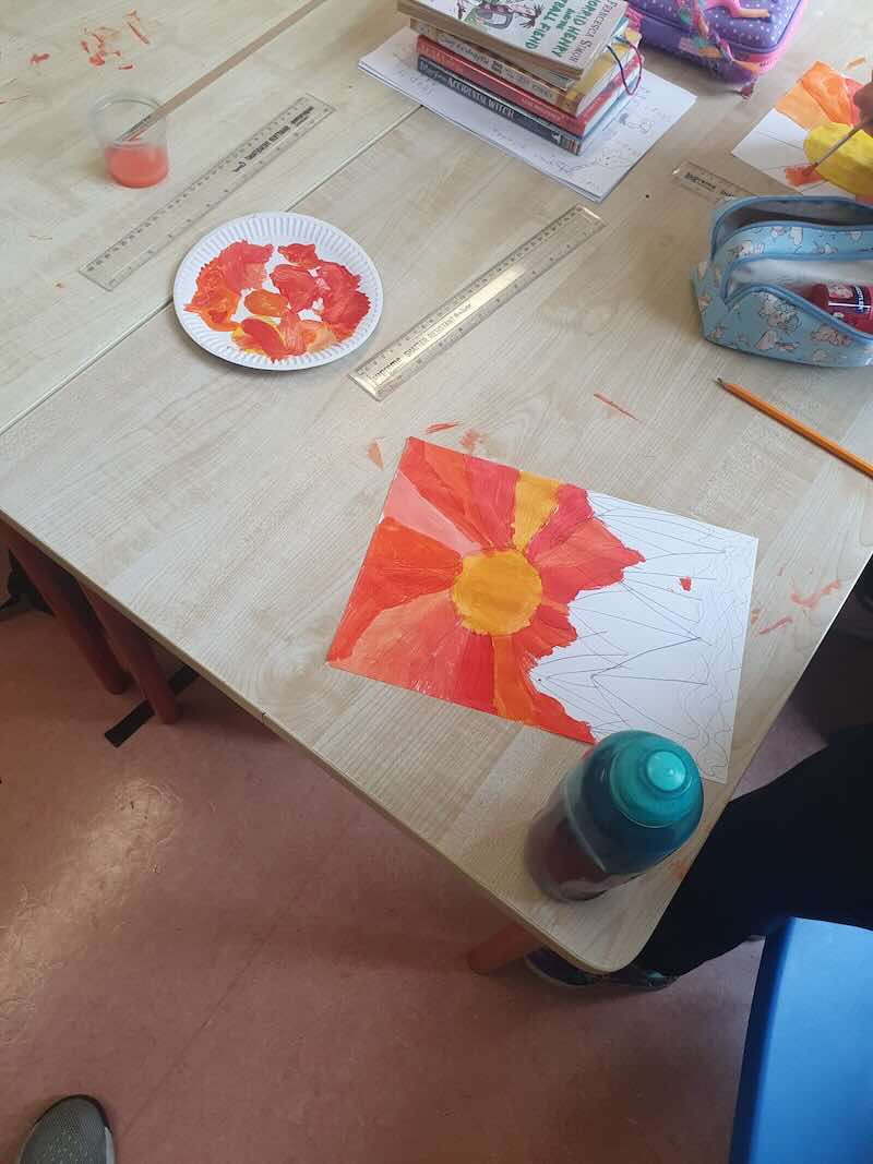The children in 2nd class have been busy painting. They mixed up different colours to make the correct colour of the sun and created some masterpieces for the classroom wall.