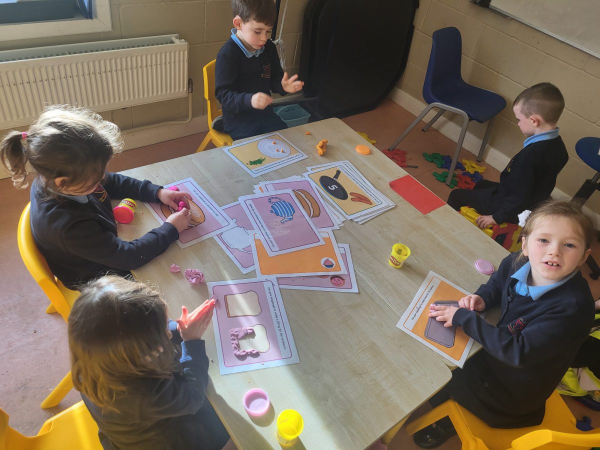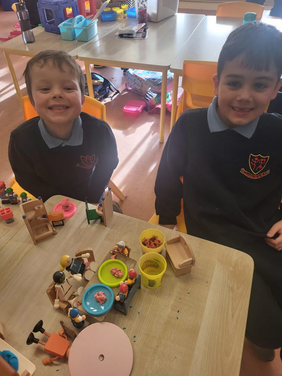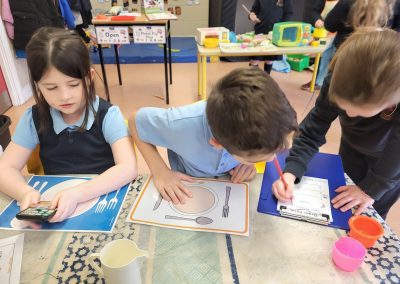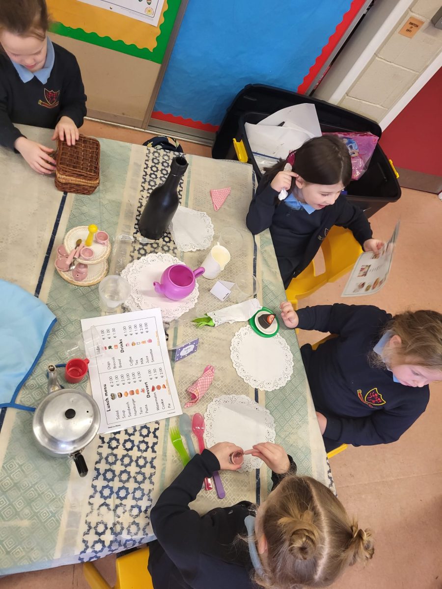 Fine motor: Working with playdough/writing menus/cutting and sticking/designing tea sets.