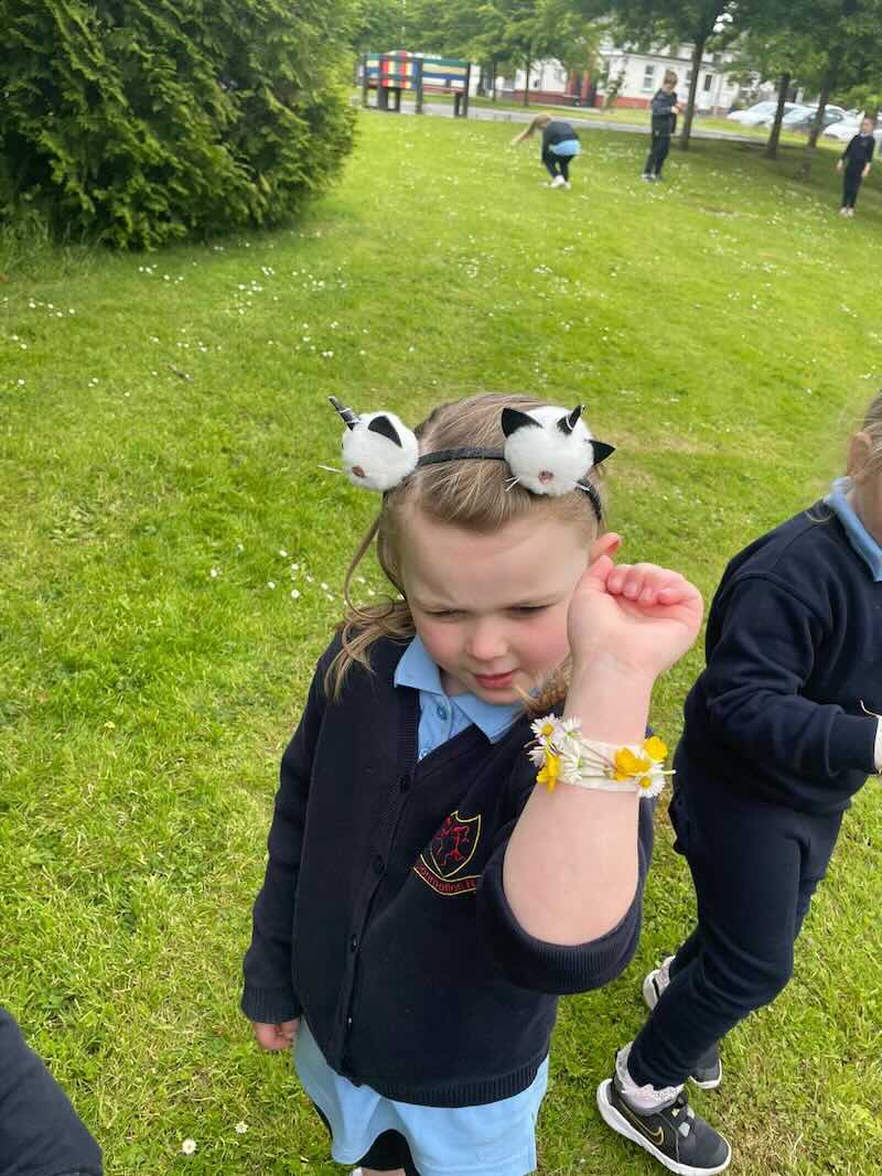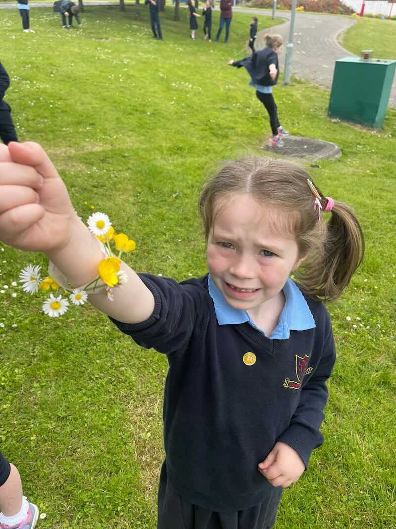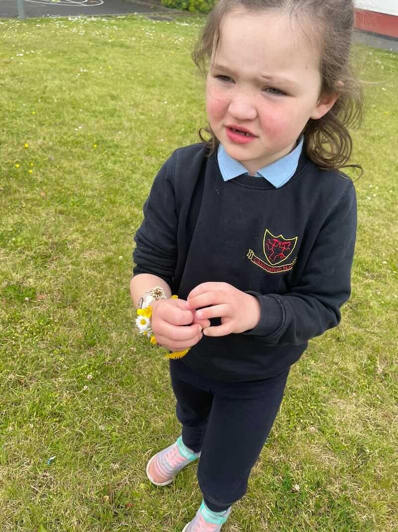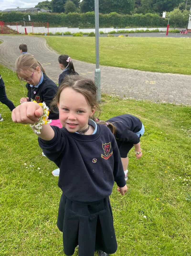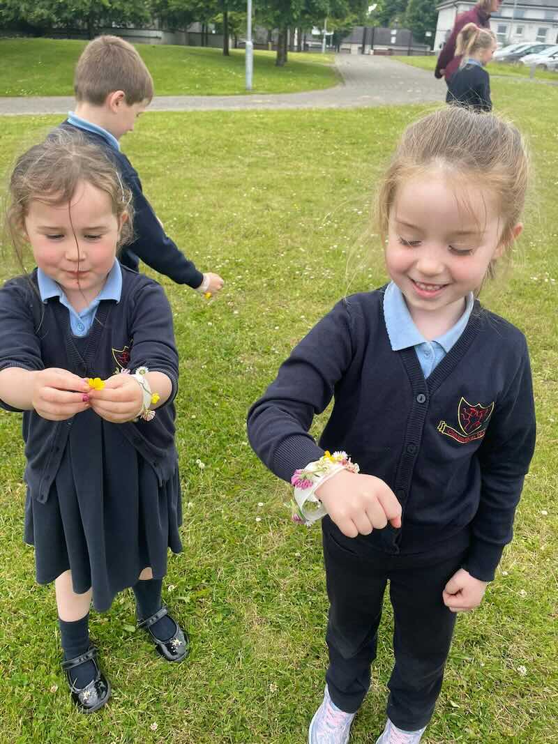 As part of SESE the children from Junior Infants enjoyed exploring the flowers in the school. They picked some and made flower bracelets which they were very proud of.