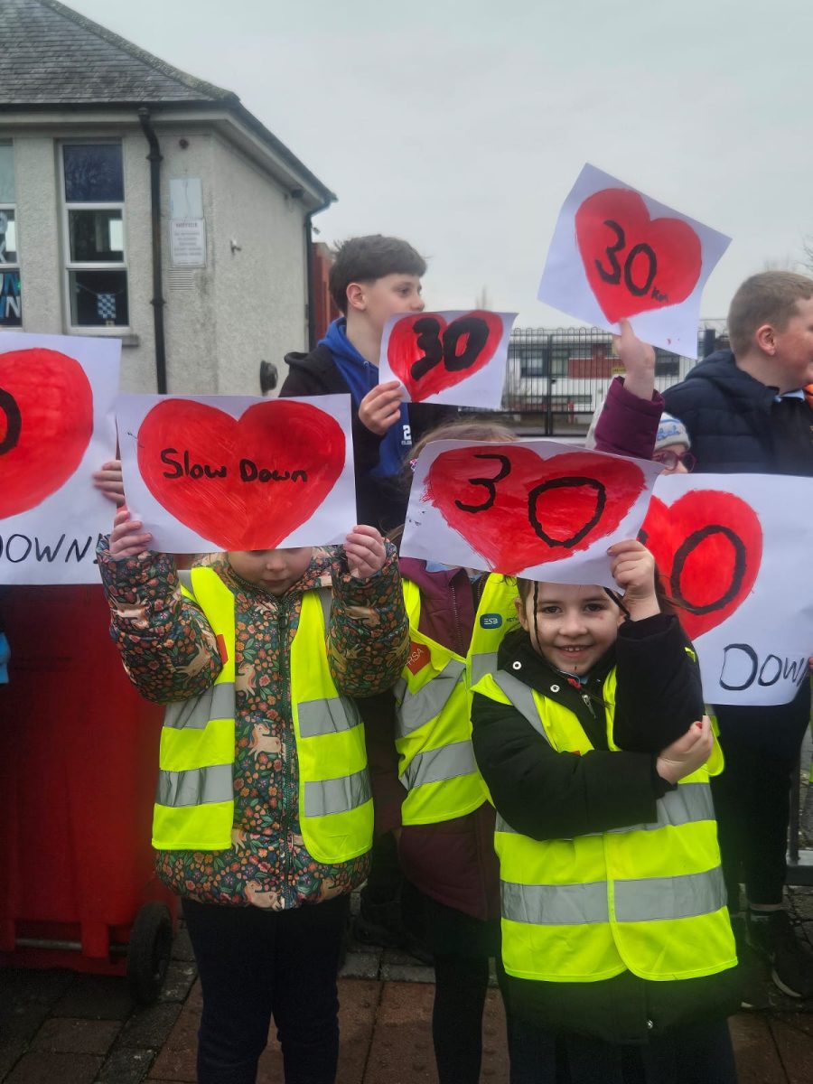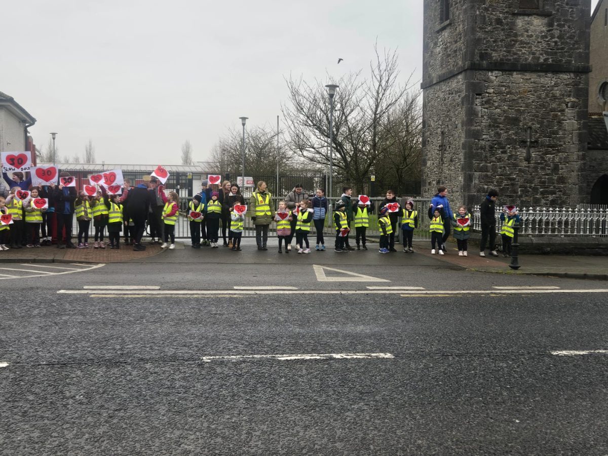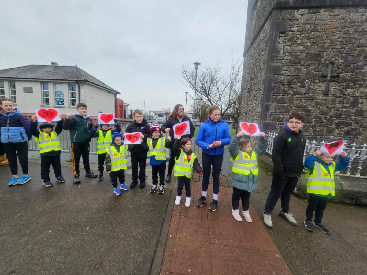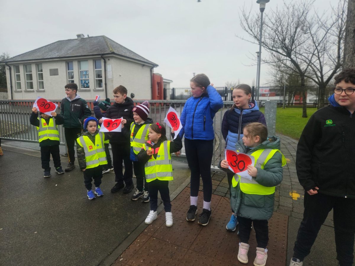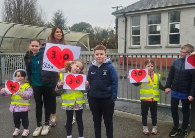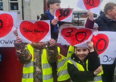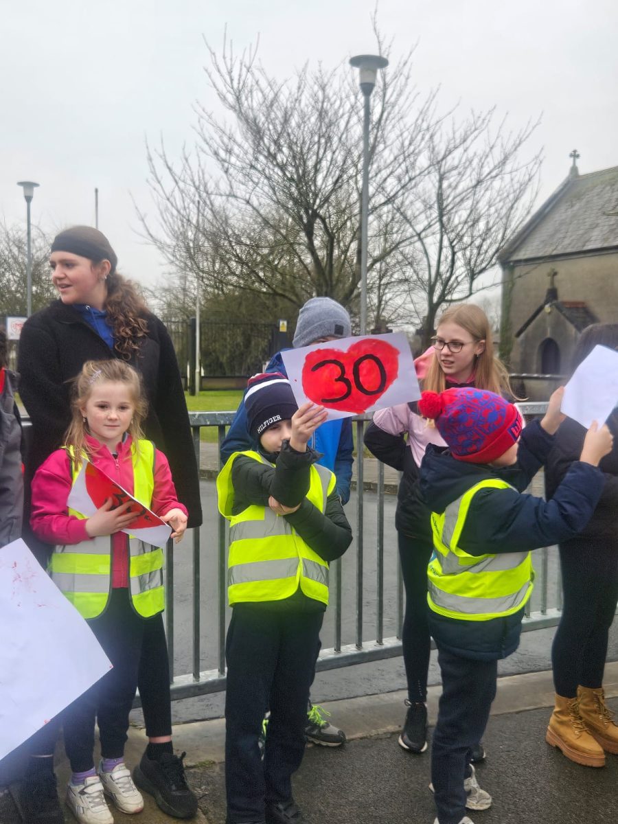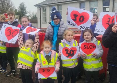 6th Class children and their junior infants buddies made signs for a peaceful demonstration to encourage vehicles to slow down to 30 km per hour for the safety of the people in the village.