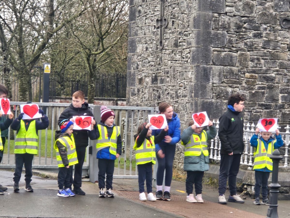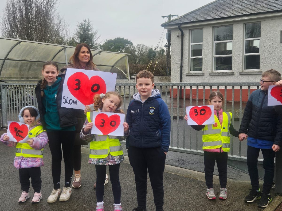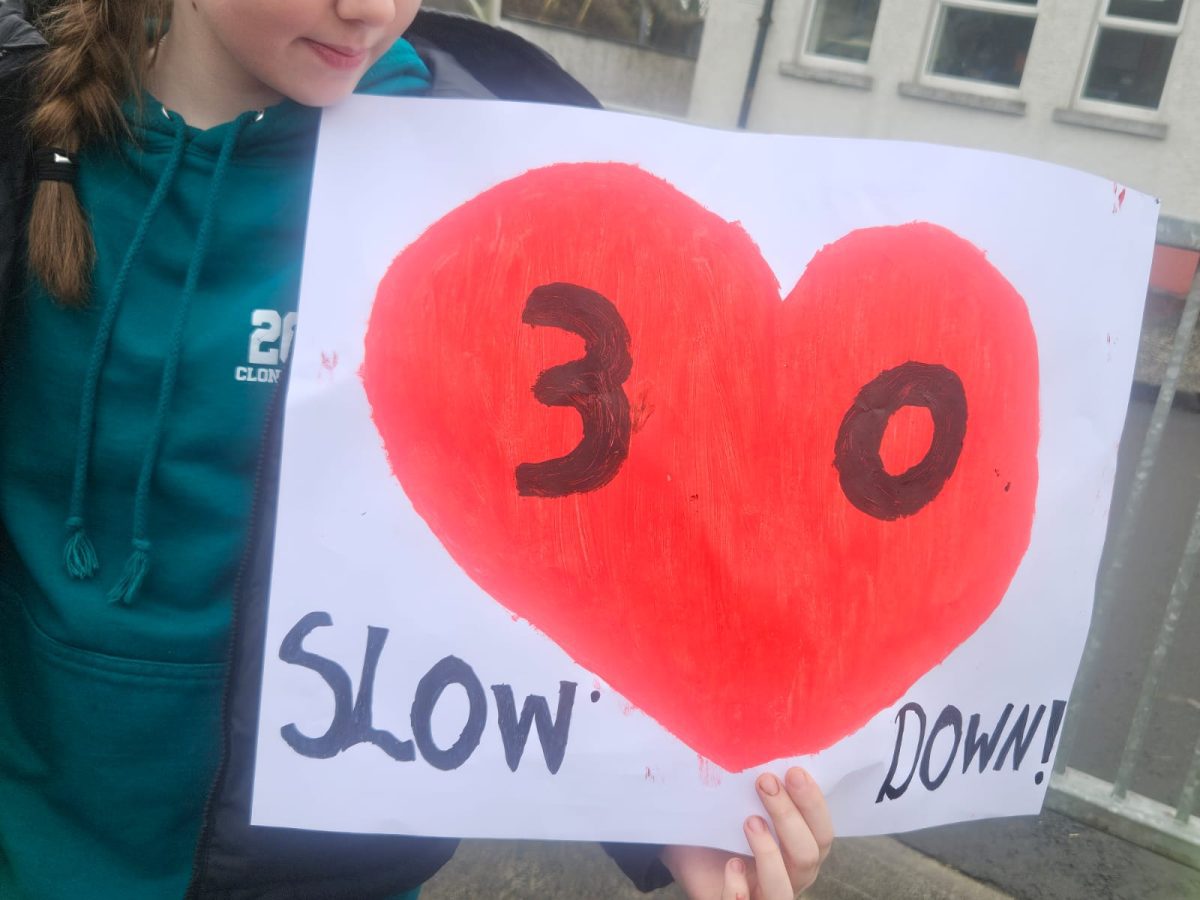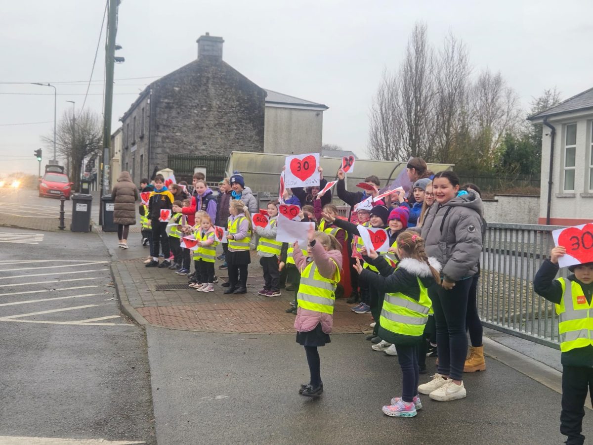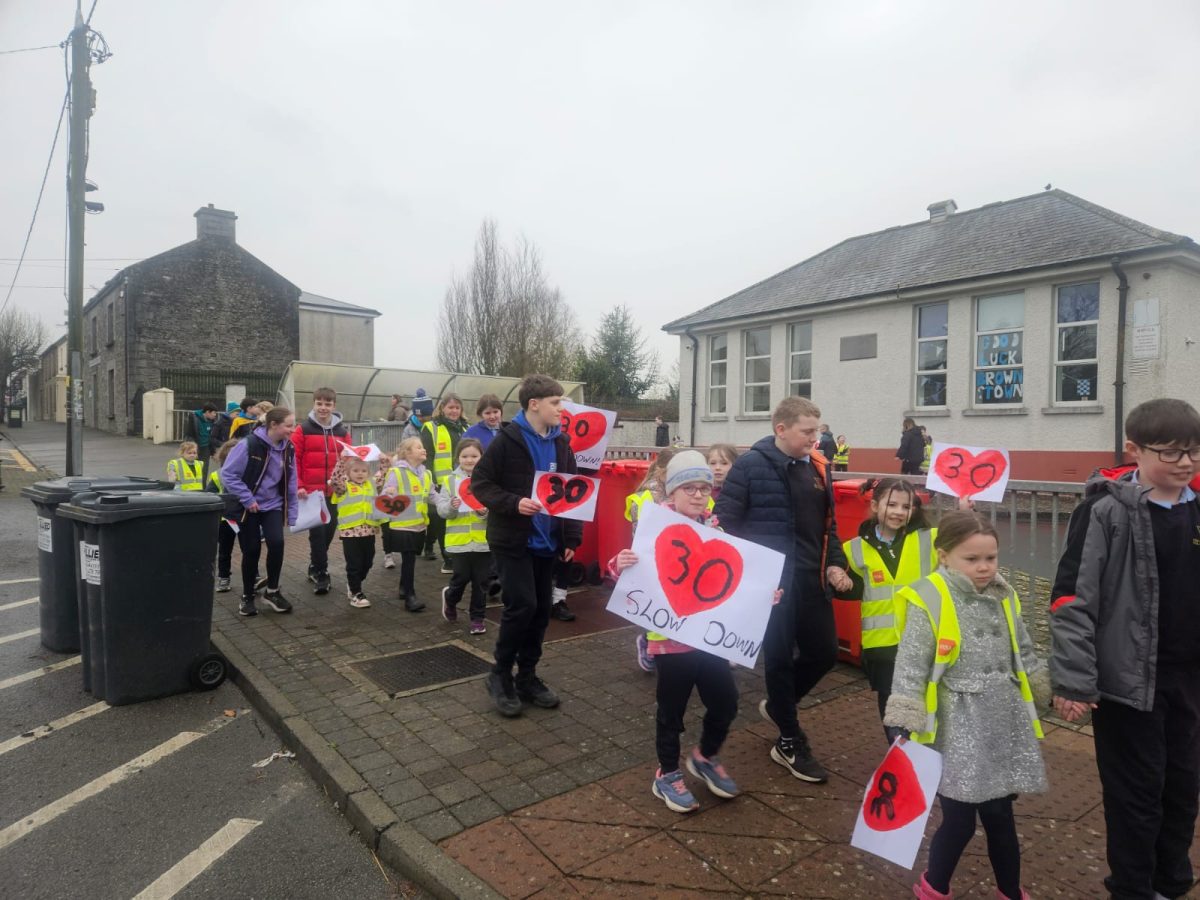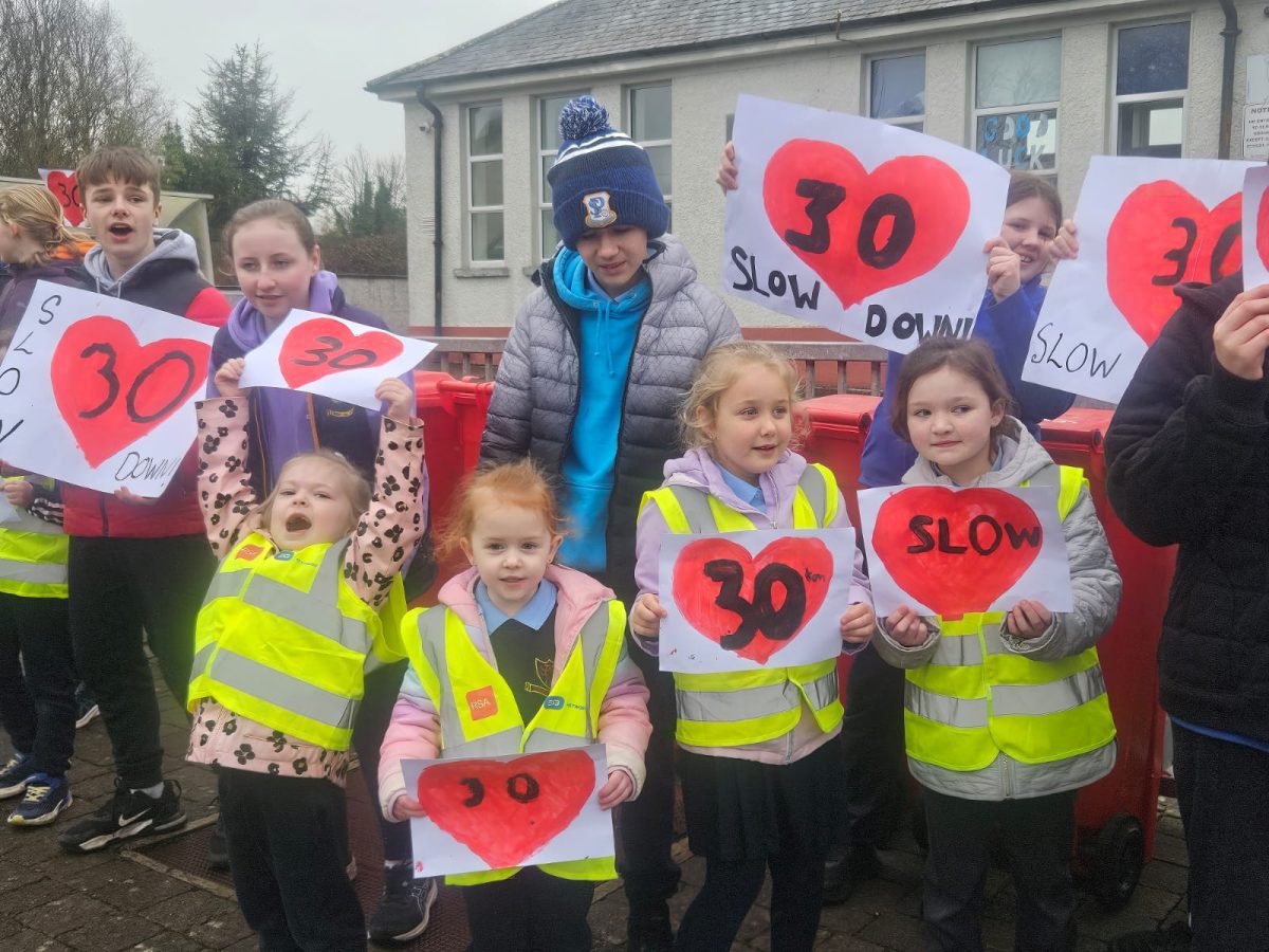 6th Class children and their junior infants buddies made signs for a peaceful demonstration to encourage vehicles to slow down to 30 km per hour for the safety of the people in the village.