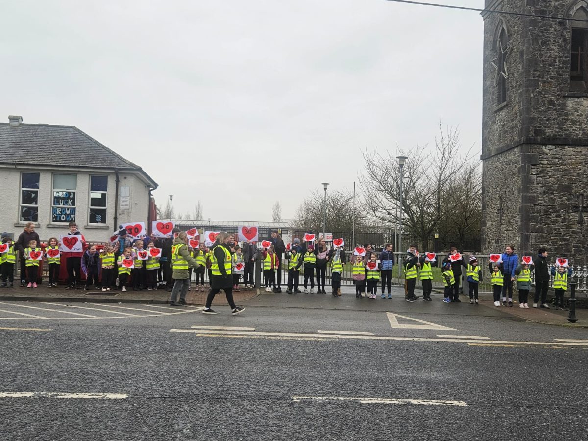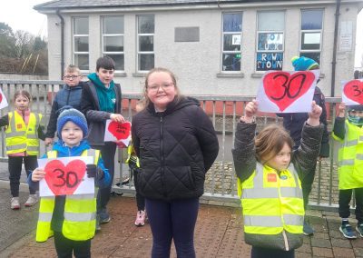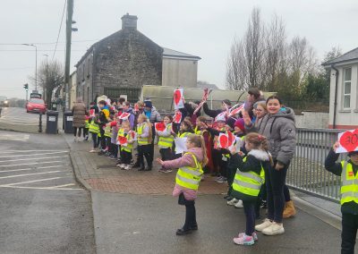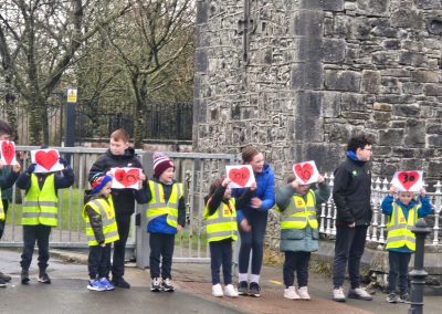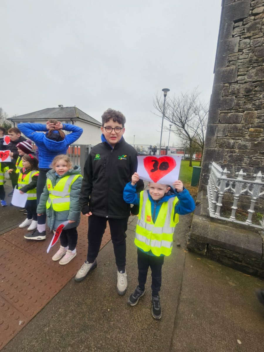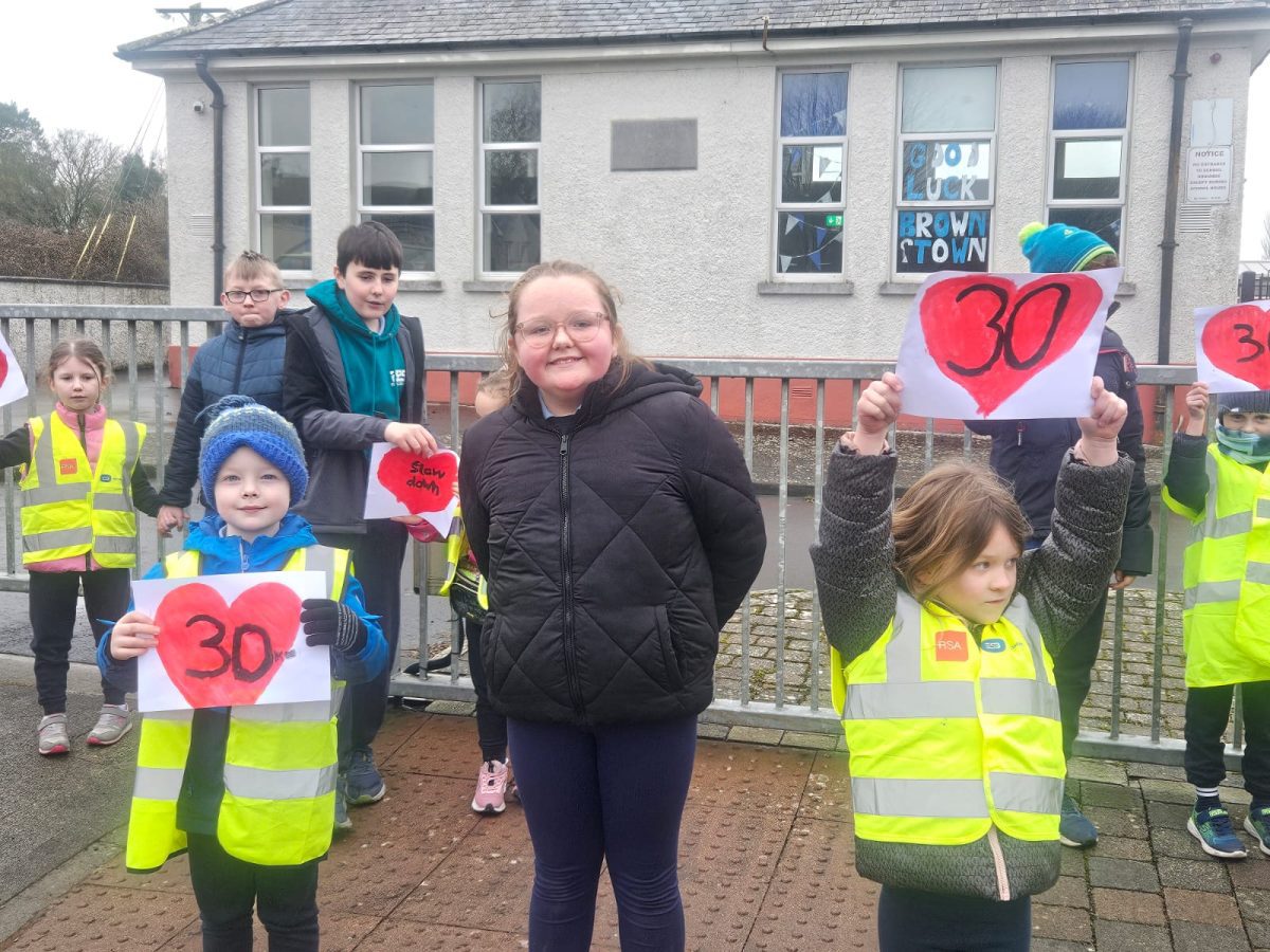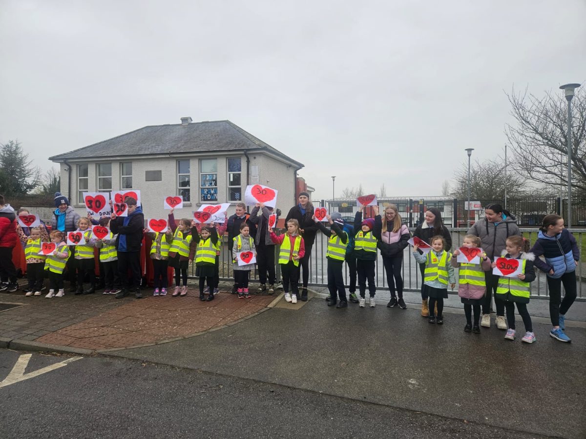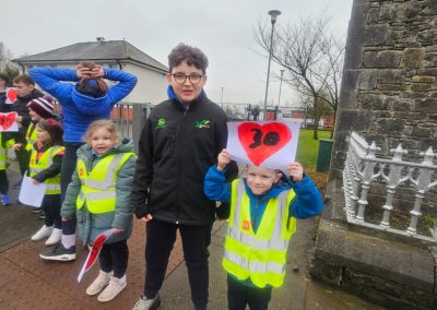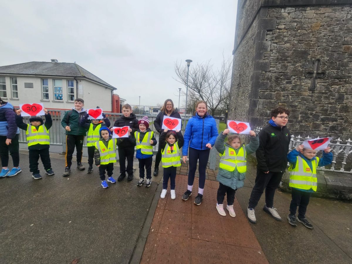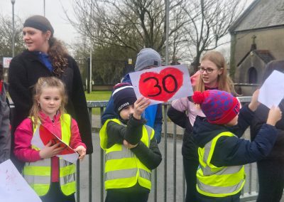 6th Class children and their junior infants buddies made signs for a peaceful demonstration to encourage vehicles to slow down to 30 km per hour for the safety of the people in the village.
