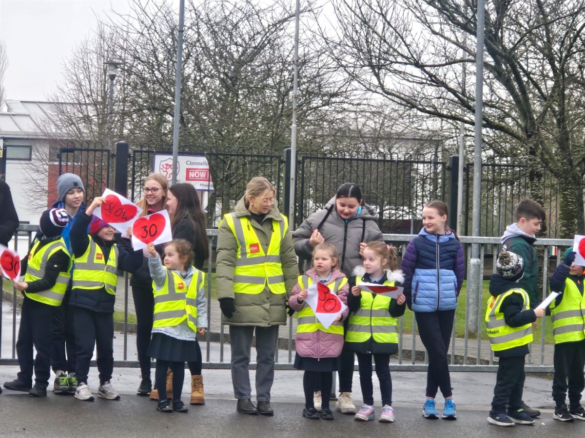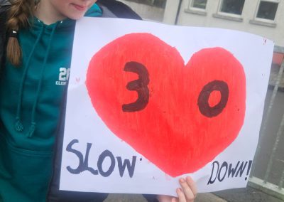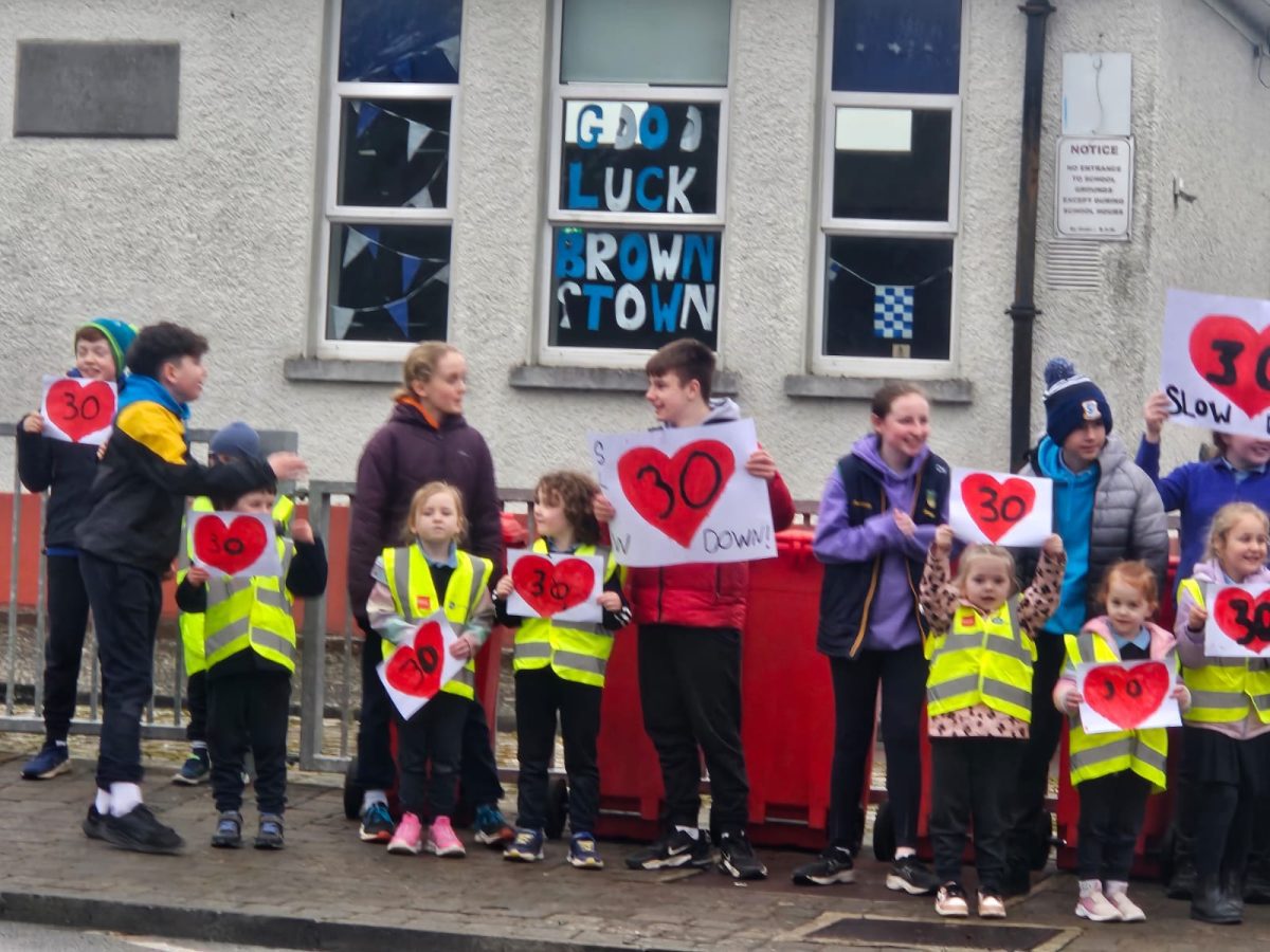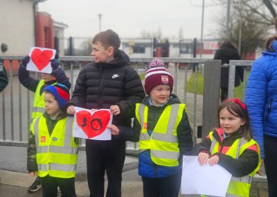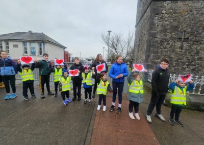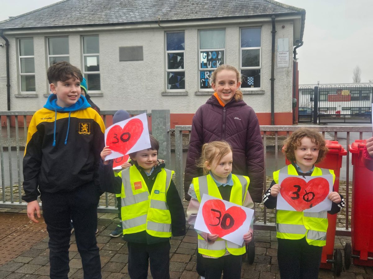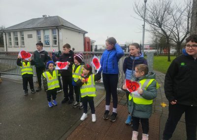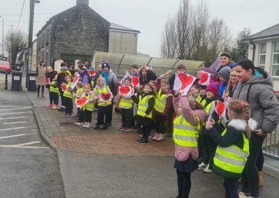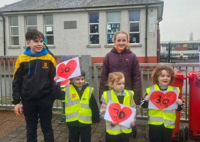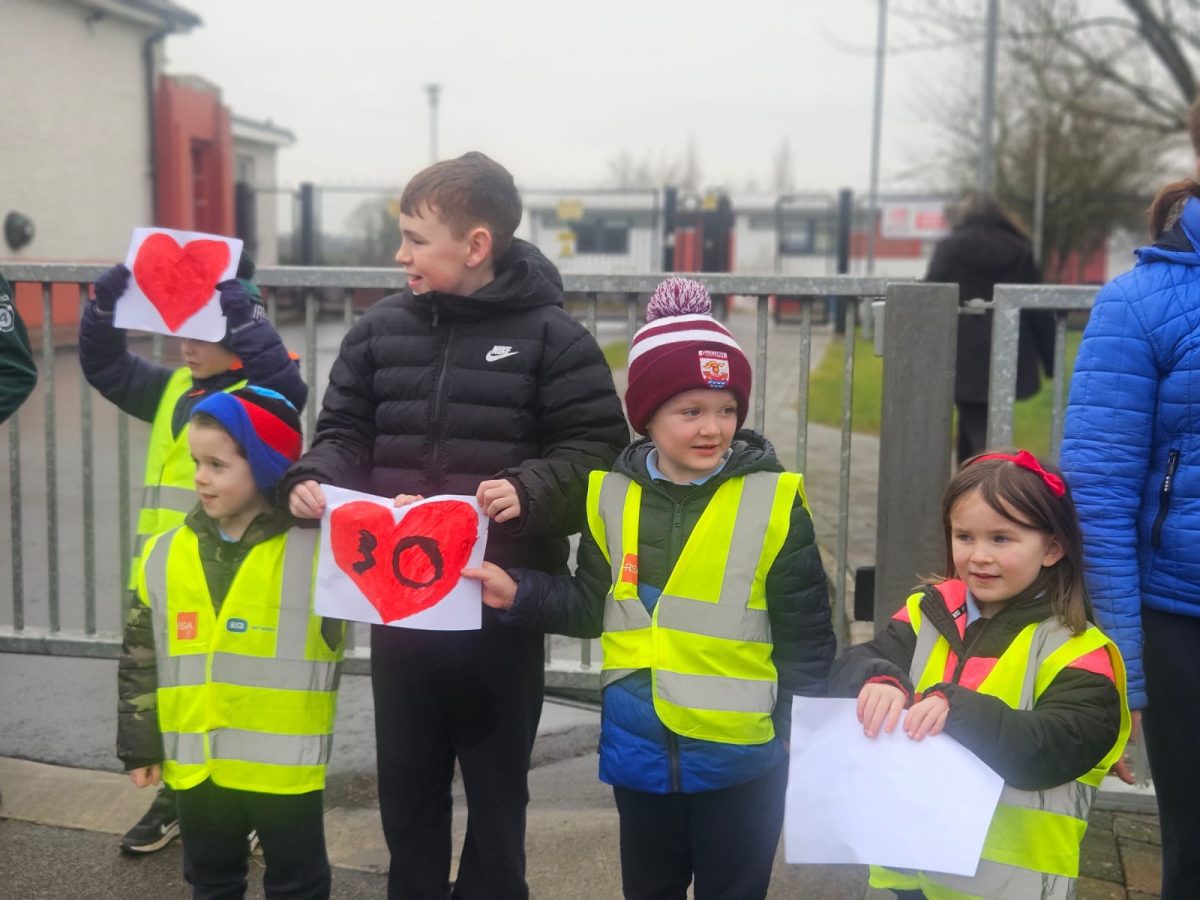 6th Class children and their junior infants buddies made signs for a peaceful demonstration to encourage vehicles to slow down to 30 km per hour for the safety of the people in the village.