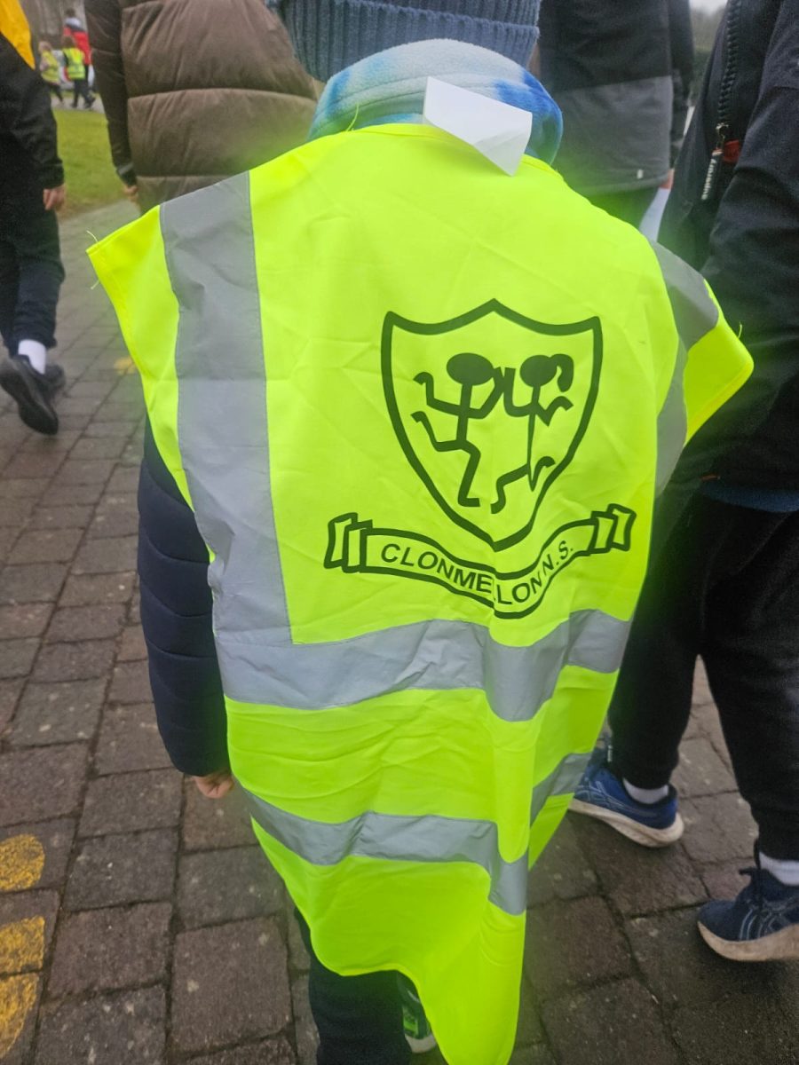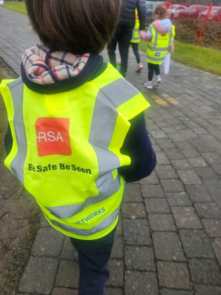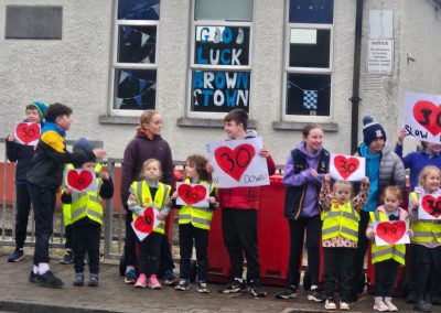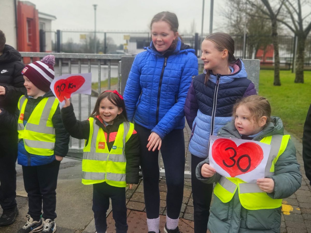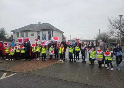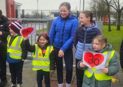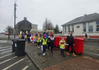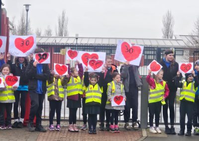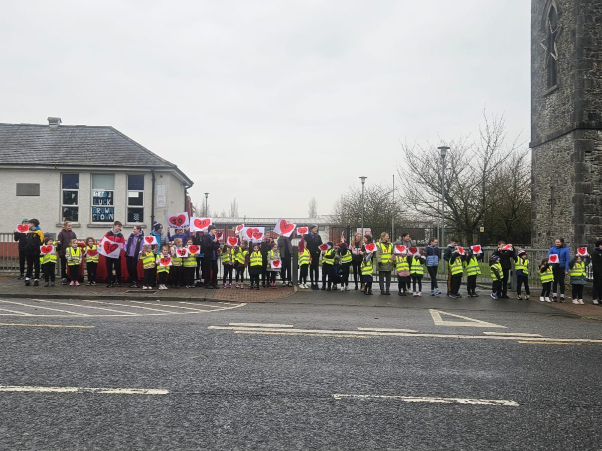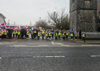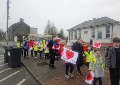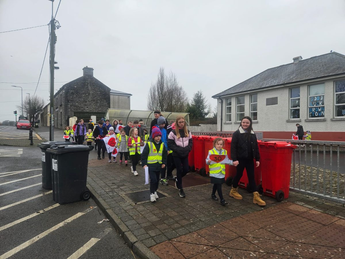 6th Class children and their junior infants buddies made signs for a peaceful demonstration to encourage vehicles to slow down to 30 km per hour for the safety of the people in the village.