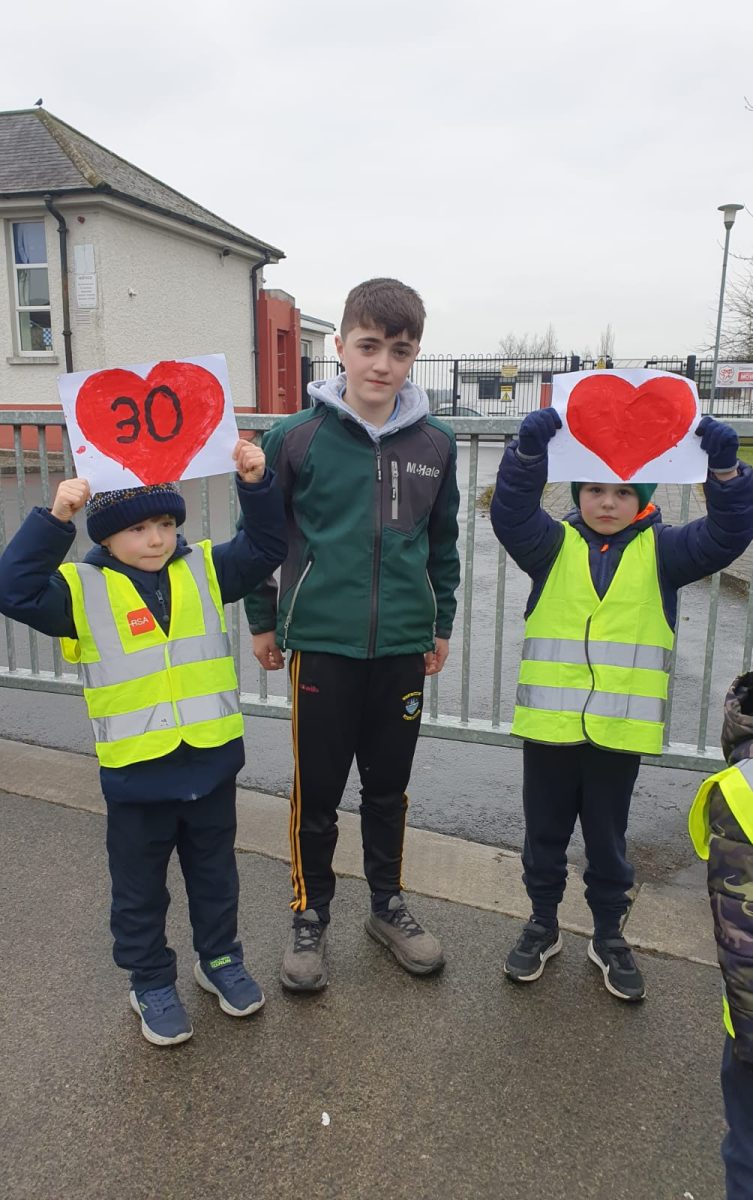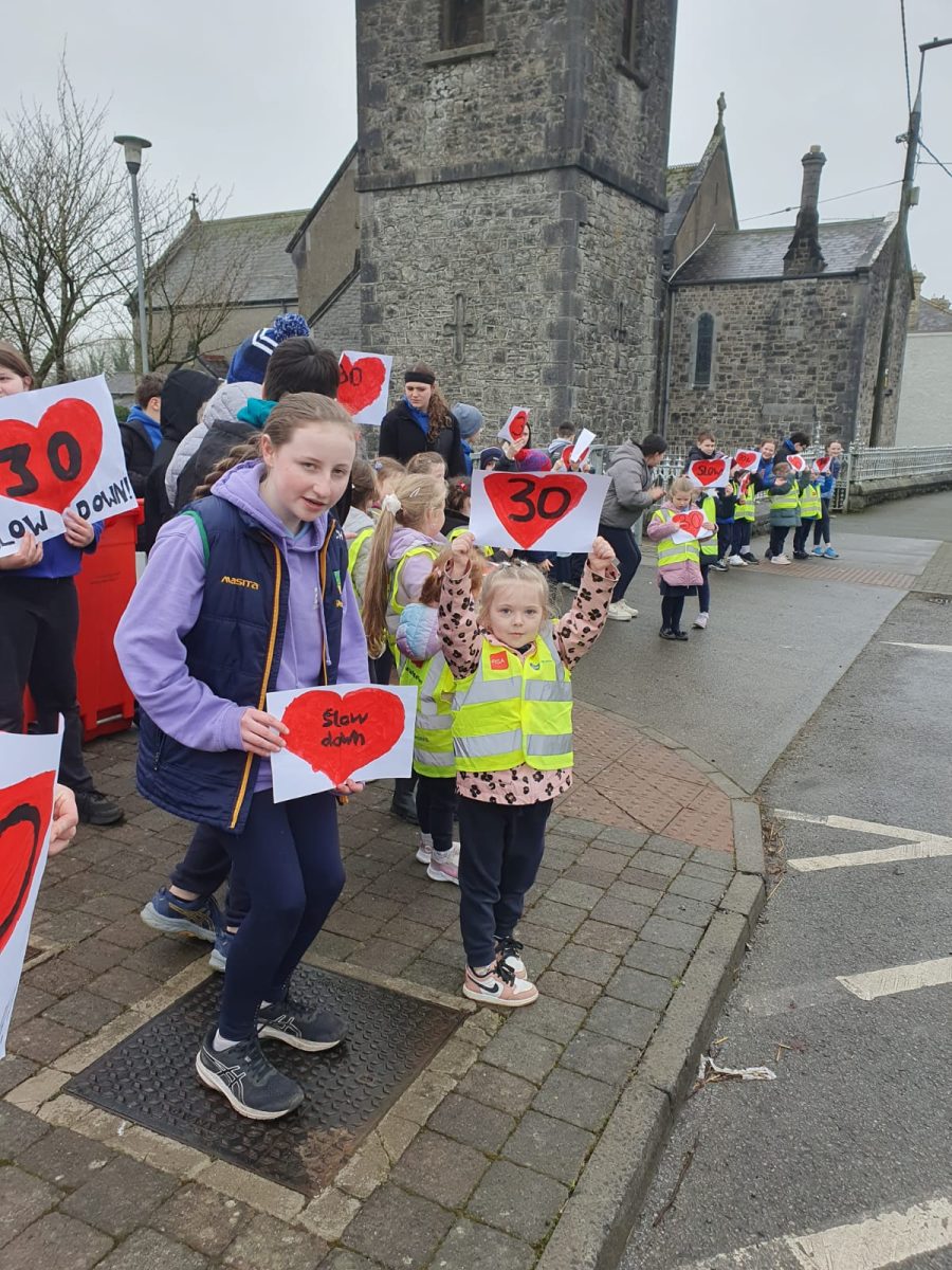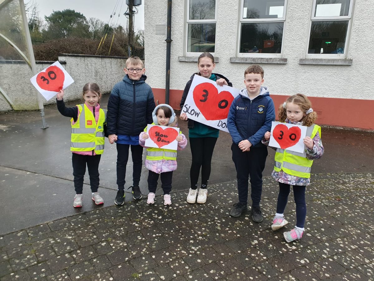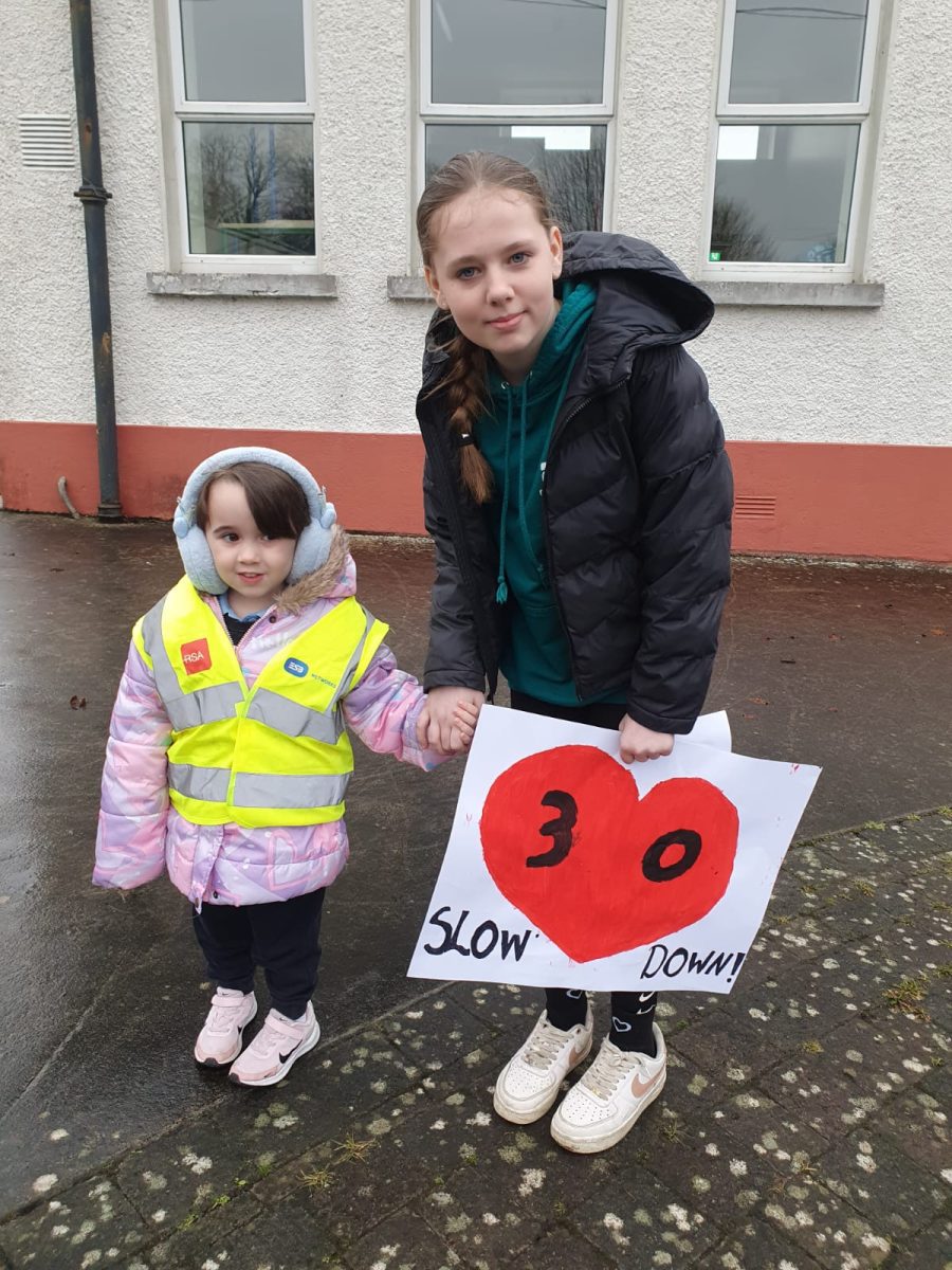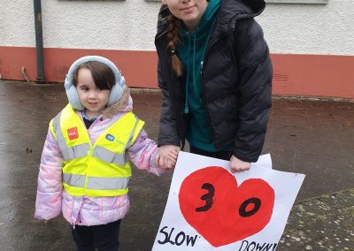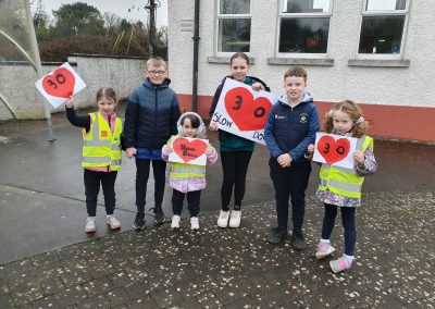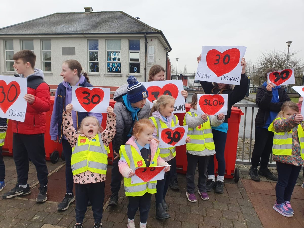 Some recent photos of Junior infants with their 6th Class buddies who took part in a speed awareness initiative outside the school to try encourage vehicles to slow down.